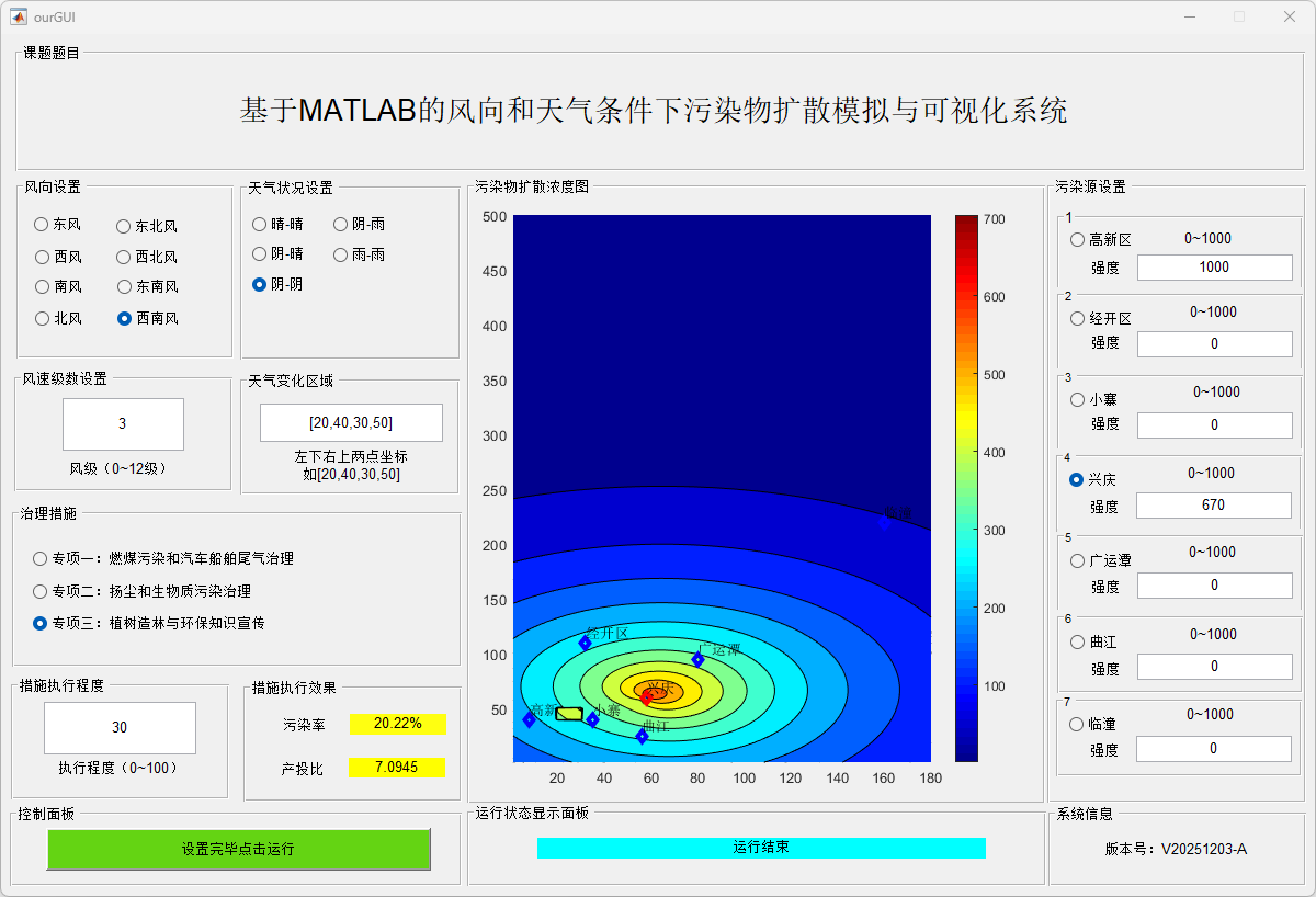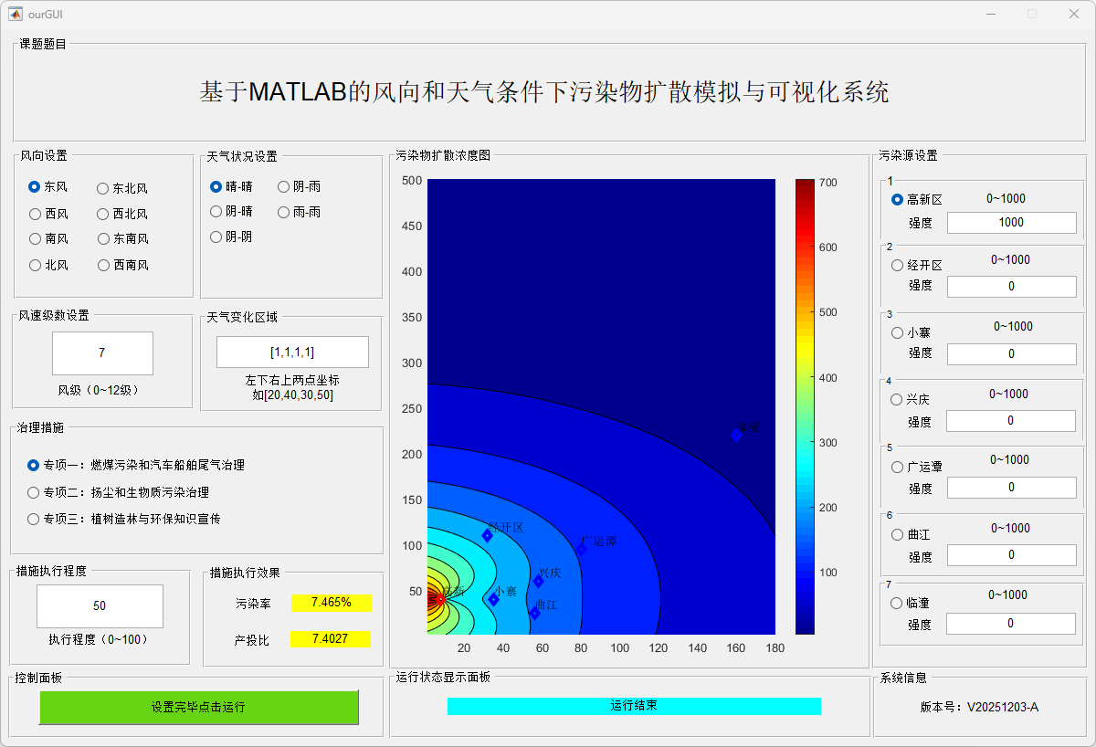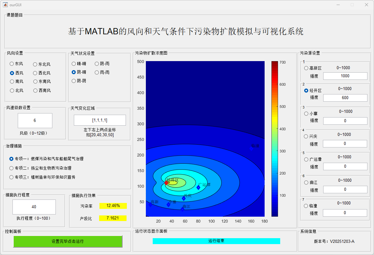 本系统基于MATLAB图形用户界面(GUI)实现,通过输入风速、风向、天气条件等参数,模拟和可视化多源污染物在不同气象条件下的扩散浓度,帮助用户直观分析污染物的空间分布和控制效果。