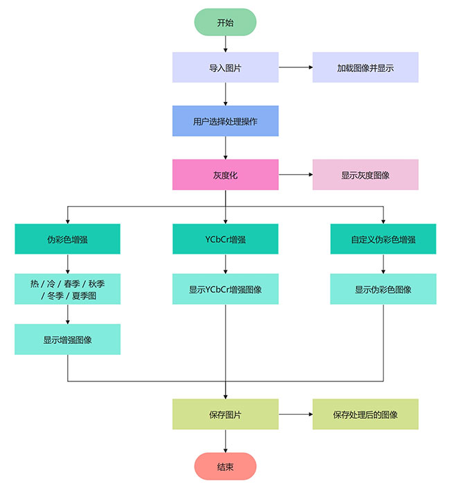 系统设计部分基于图像处理技术,采用图形用户界面(GUI)架构,通过多种颜色映射方法和YCbCr颜色空间增强算法,提供了直观的图像加载、处理和保存功能,旨在提升图像的视觉效果并满足不同用户的需求。