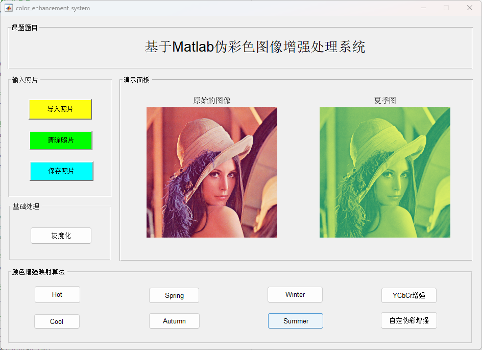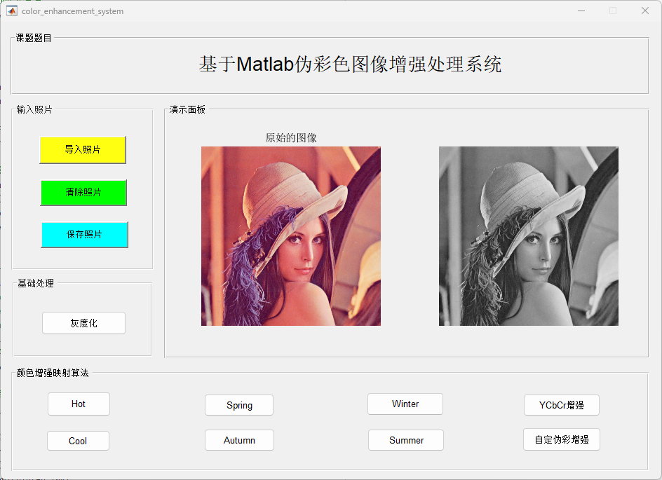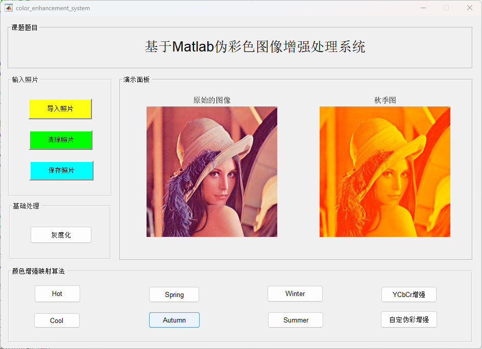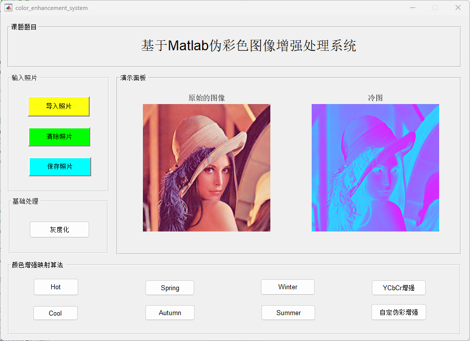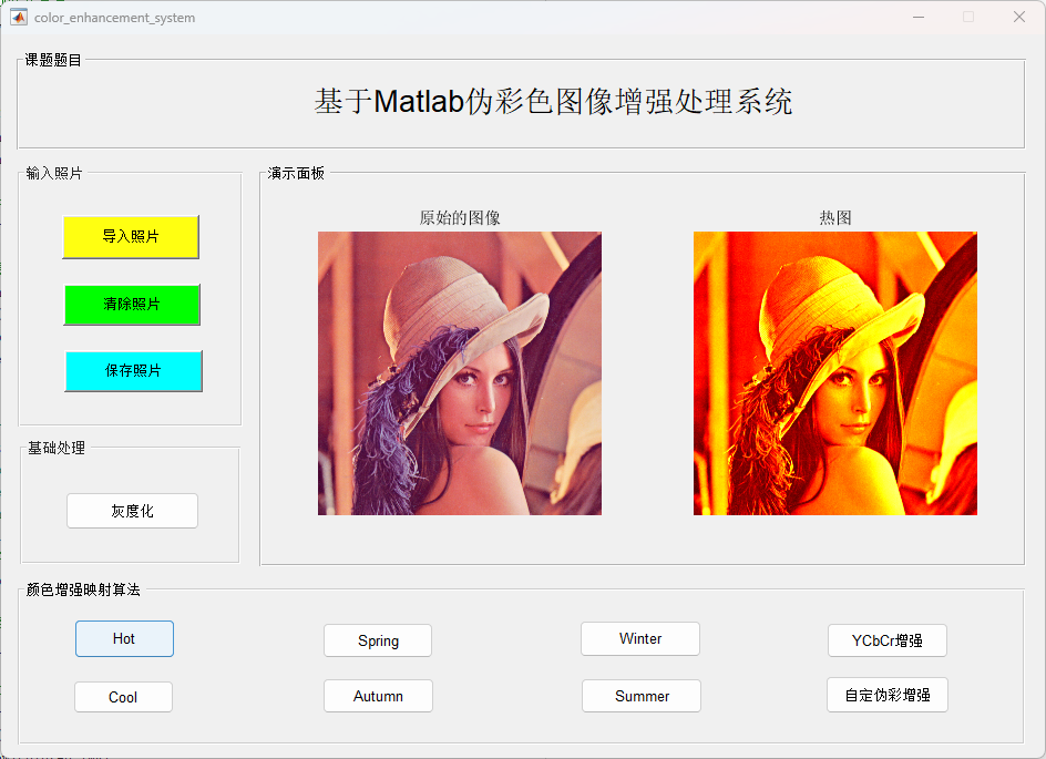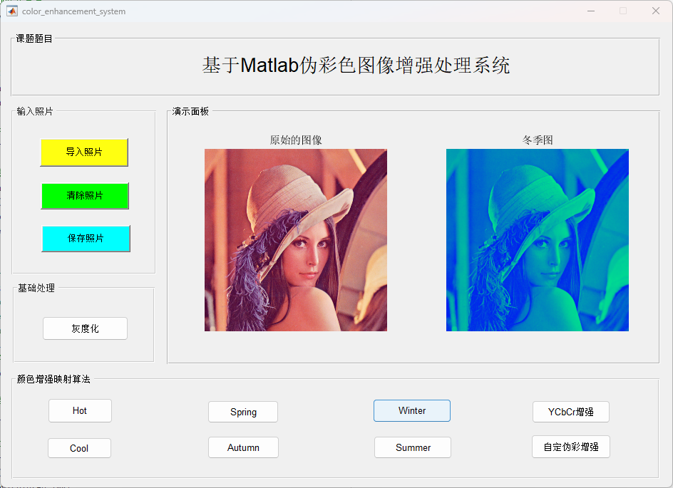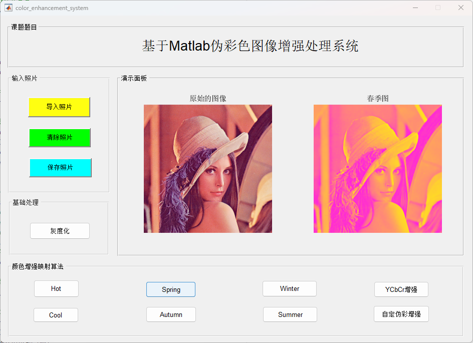 摘要:本研究提出了一种基于图像处理的颜色增强系统,旨在通过多种颜色映射方法提升图像的视觉效果。系统首先将输入的彩色图像转换为灰度图像,然后应用一系列伪彩色映射(包括热图、冷图、春季图、秋季图、冬季图、夏季图等),通过不同的色调增强图像的细节和对比度。