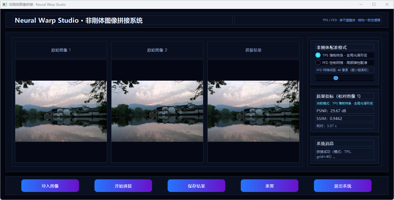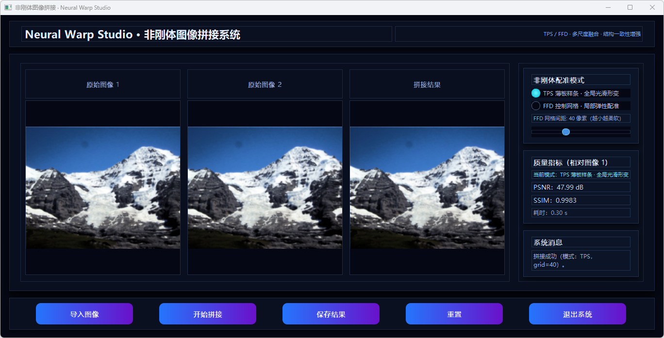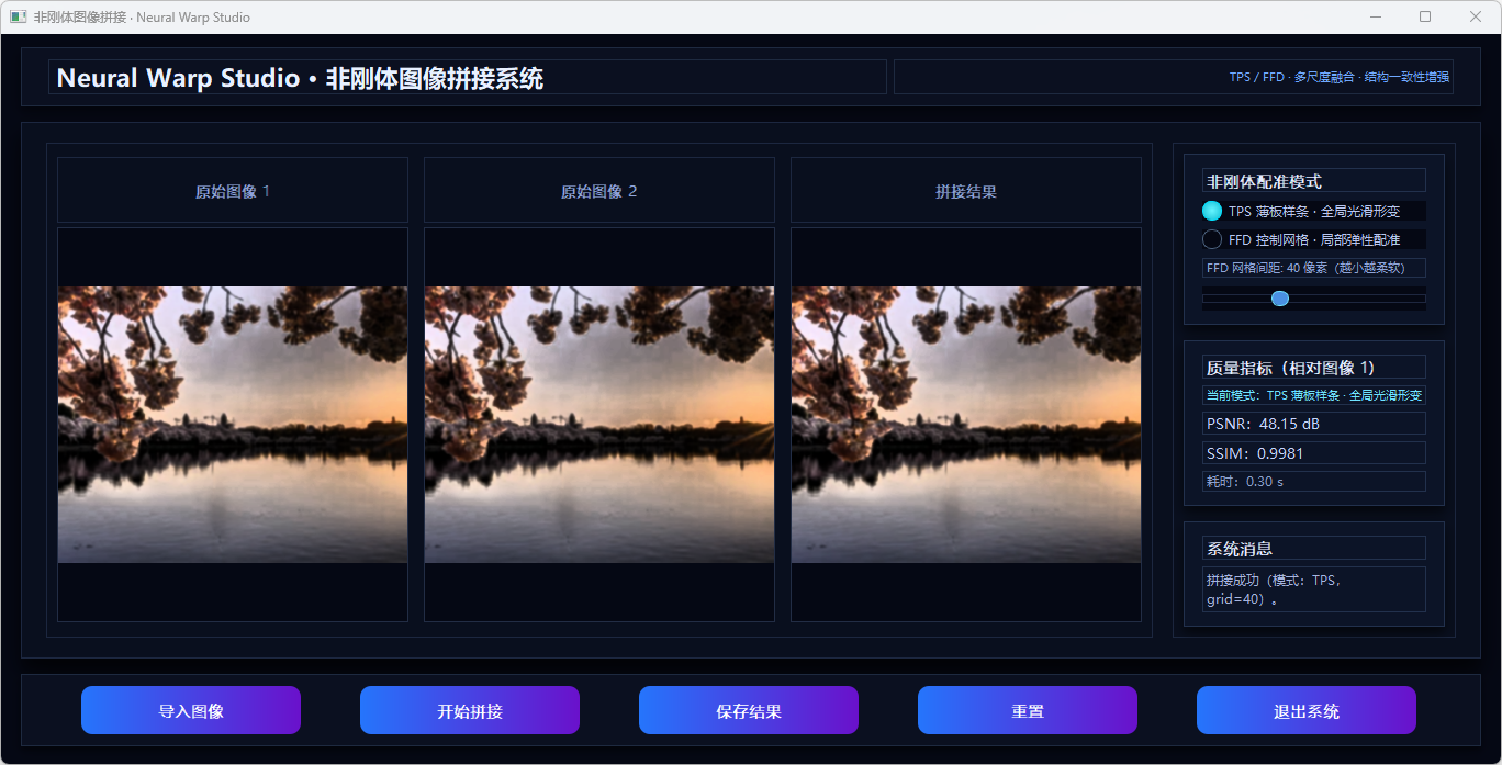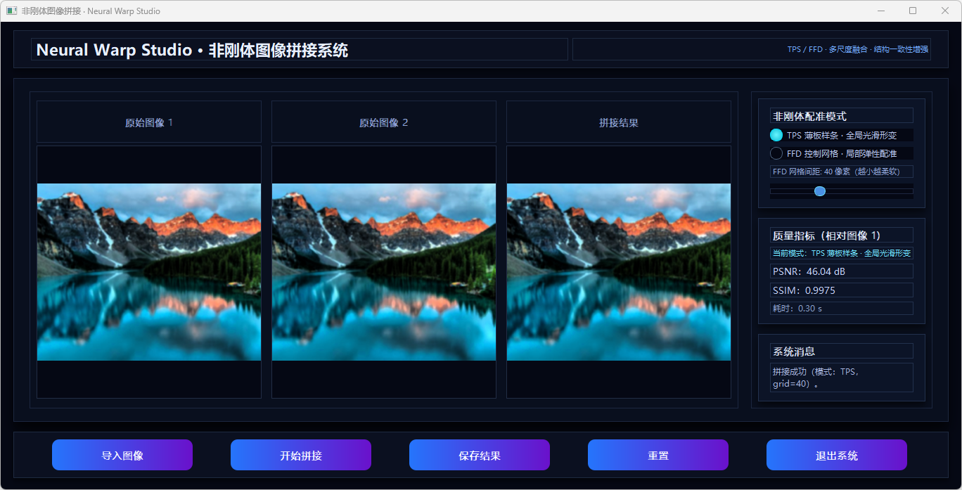 摘要:非刚体图像拼接是计算机视觉领域的重要研究方向,广泛应用于场景重建、医学影像对齐、全景生成等任务。传统刚体或透视变换难以处理由于视角变化、镜头畸变或场景形变所引起的局部非线性位移,因此需要更柔性的非刚体配准方法。针对以上问题,本文设计并实现了一个基于薄板样条(Thin Plate Spline, TPS)与自由形变(Free-Form Deformation, FFD)的非刚体图像拼接系统 Neural Warp Studio。