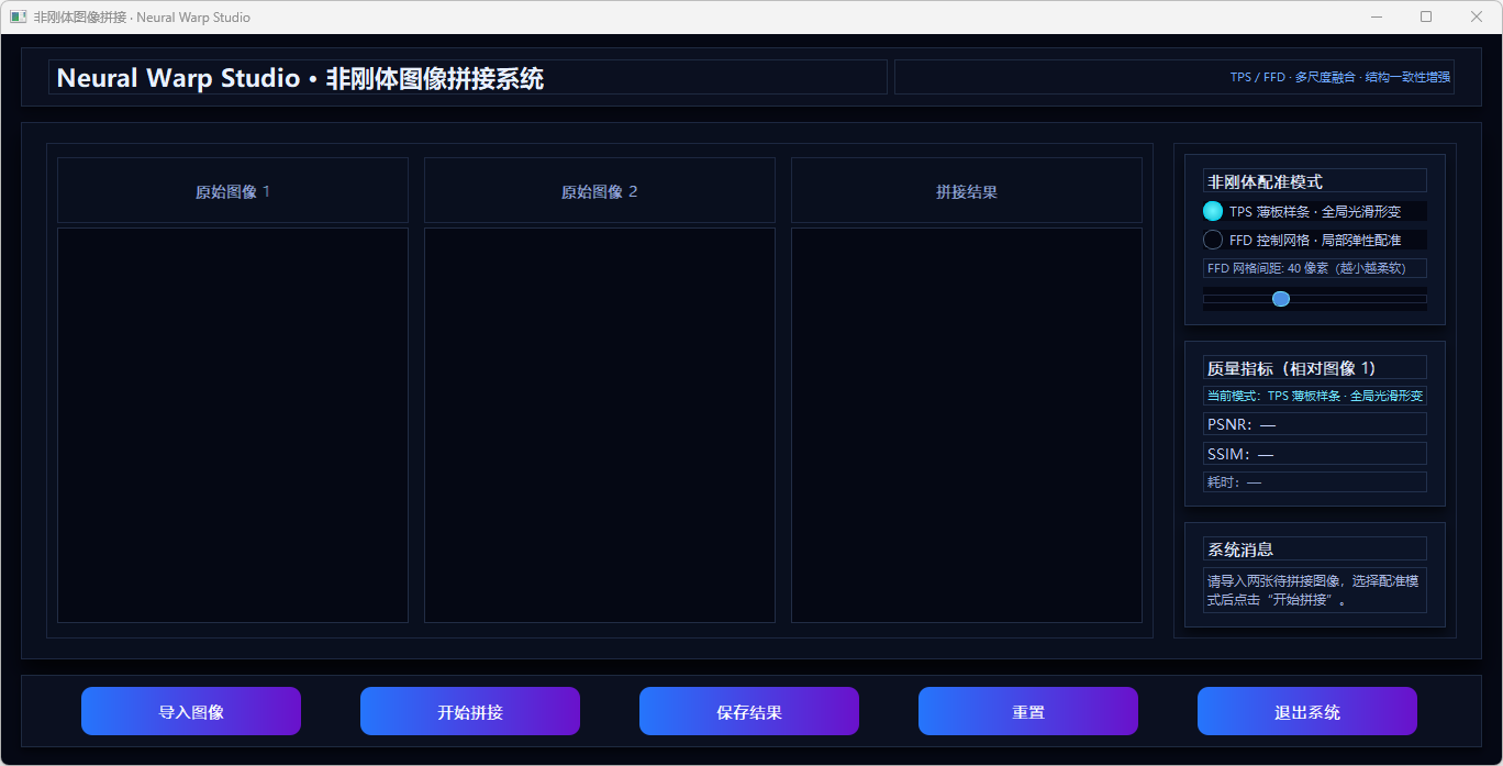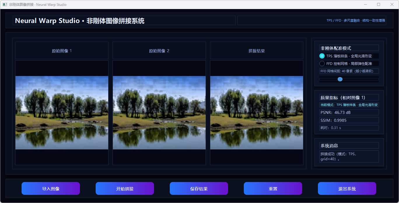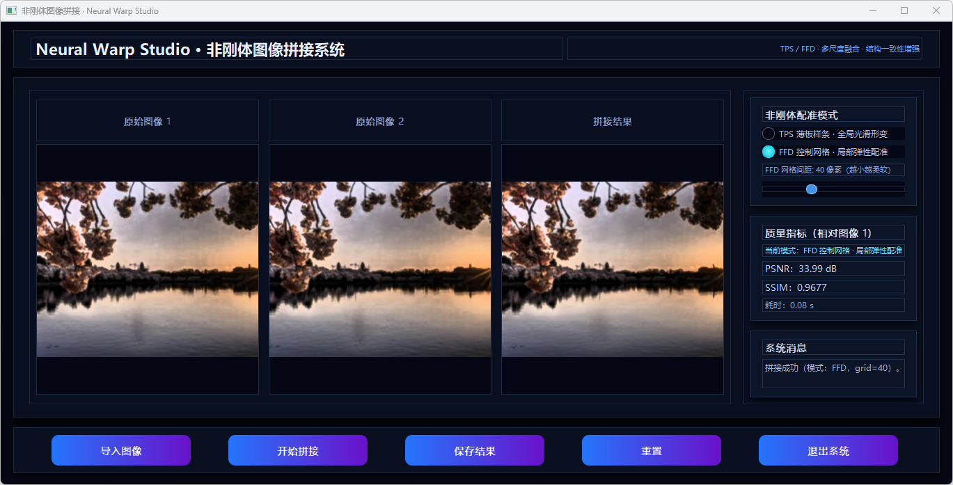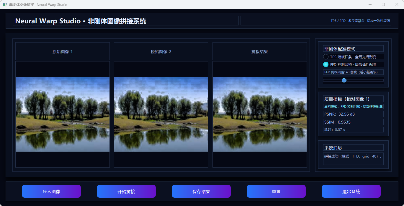 摘要:非刚体图像拼接是计算机视觉领域的重要研究方向,广泛应用于场景重建、医学影像对齐、全景生成等任务。传统刚体或透视变换难以处理由于视角变化、镜头畸变或场景形变所引起的局部非线性位移,因此需要更柔性的非刚体配准方法。针对以上问题,本文设计并实现了一个基于薄板样条(Thin Plate Spline, TPS)与自由形变(Free-Form Deformation, FFD)的非刚体图像拼接系统 Neural Warp Studio。