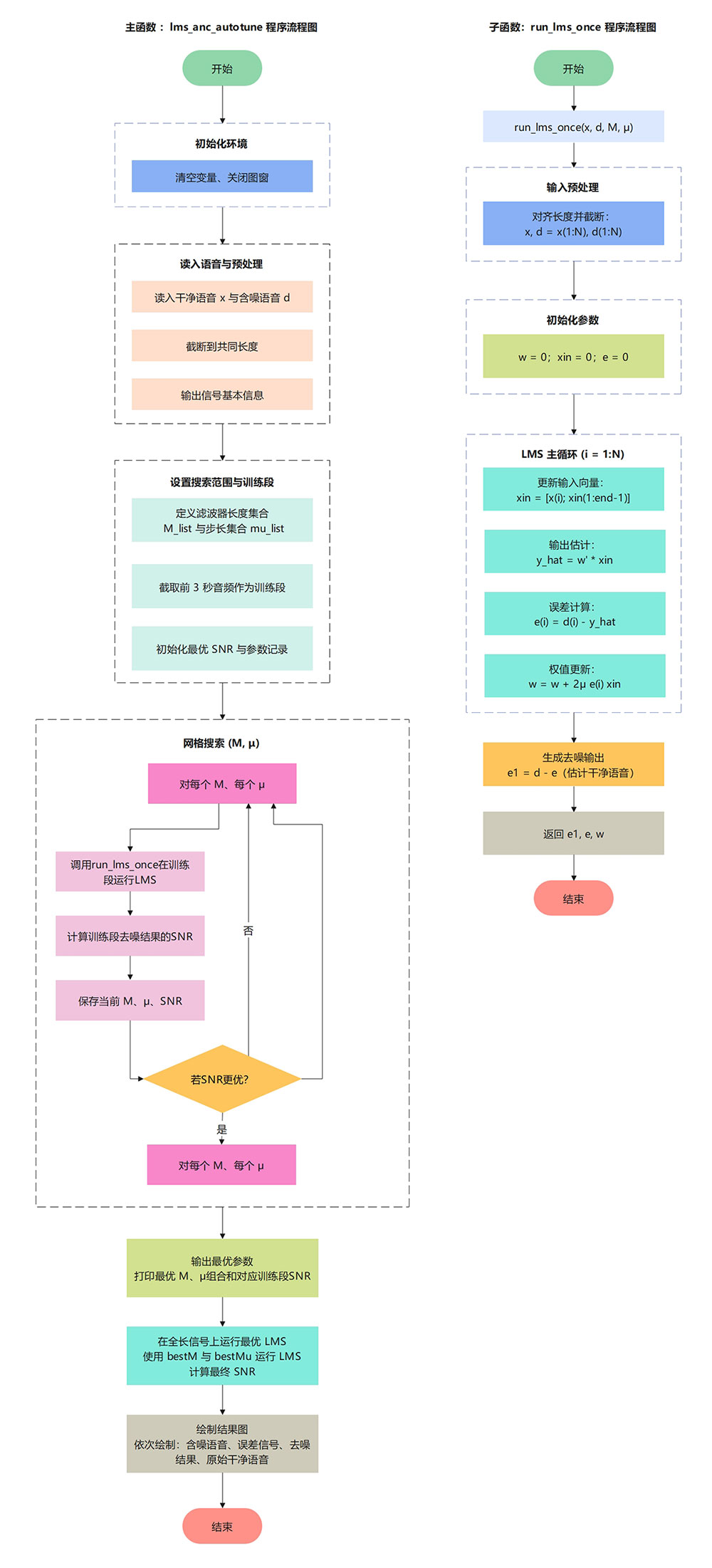 自适应噪声抵消(Adaptive Noise Cancellation, ANC)在语音增强领域中得到广泛应用,但 LMS(Least Mean Squares)算法的性能高度依赖步长与滤波器阶数的设定,传统依赖经验的调参方式难以在收敛速度与稳态误差之间取得最优折中。针对这一问题,本文提出一种面向语音信号信噪比(SNR)提升的 LMS 自动调参方法。该方法对滤波器长度𝑀与步长𝜇构建参数搜索空间,通过在训练段语音上进行网格搜索,采用输出信号与参考干净语音之间的 SNR 作为优化目标,从而实现 LMS 参数的自动化选择。随后,将获得的最优参数应用于全长信号以执行自适应噪声抵消。