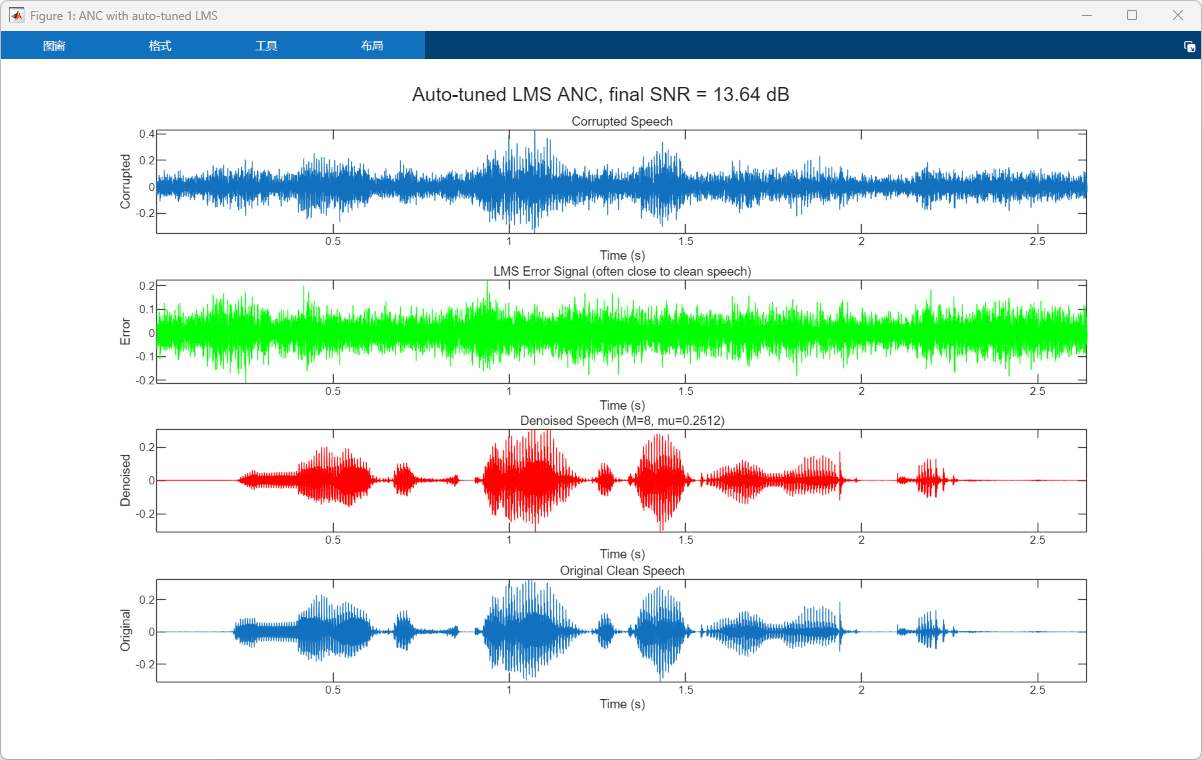 基于含真实环境噪声的语音数据进行的实验表明,该方法能够显著提升输出 SNR,相较于传统人工调参方式表现出更优的降噪效果与稳定性。研究结果验证了将自动化参数优化策略与经典自适应滤波结构结合的有效性,为语音降噪系统的性能提升提供了一种简单、高效且具有可扩展性的实现途径。