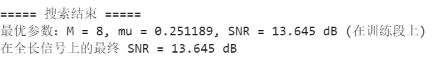 网格搜索表明 M=8、μ≈0.251 可获得最高 SNR(约 13.65 dB),验证了自动调参策略的有效性。
