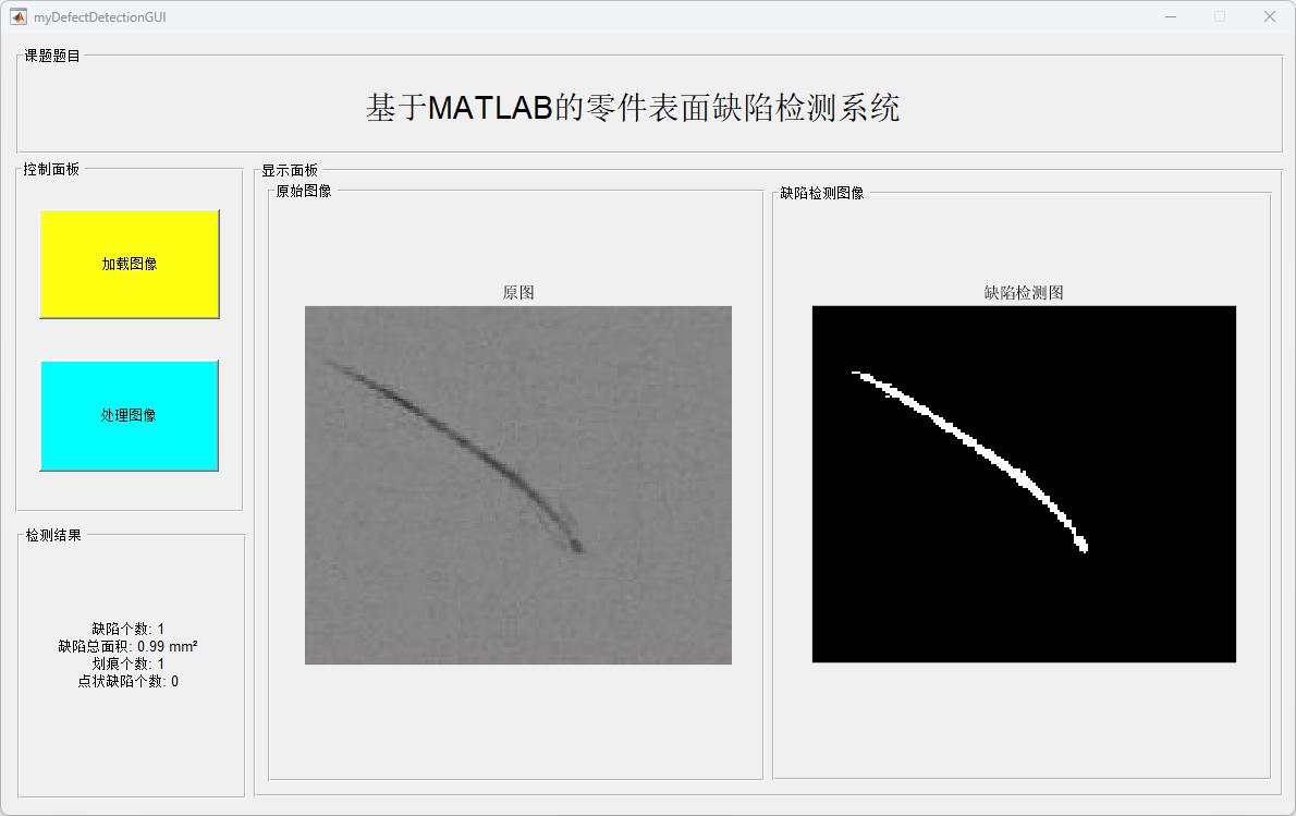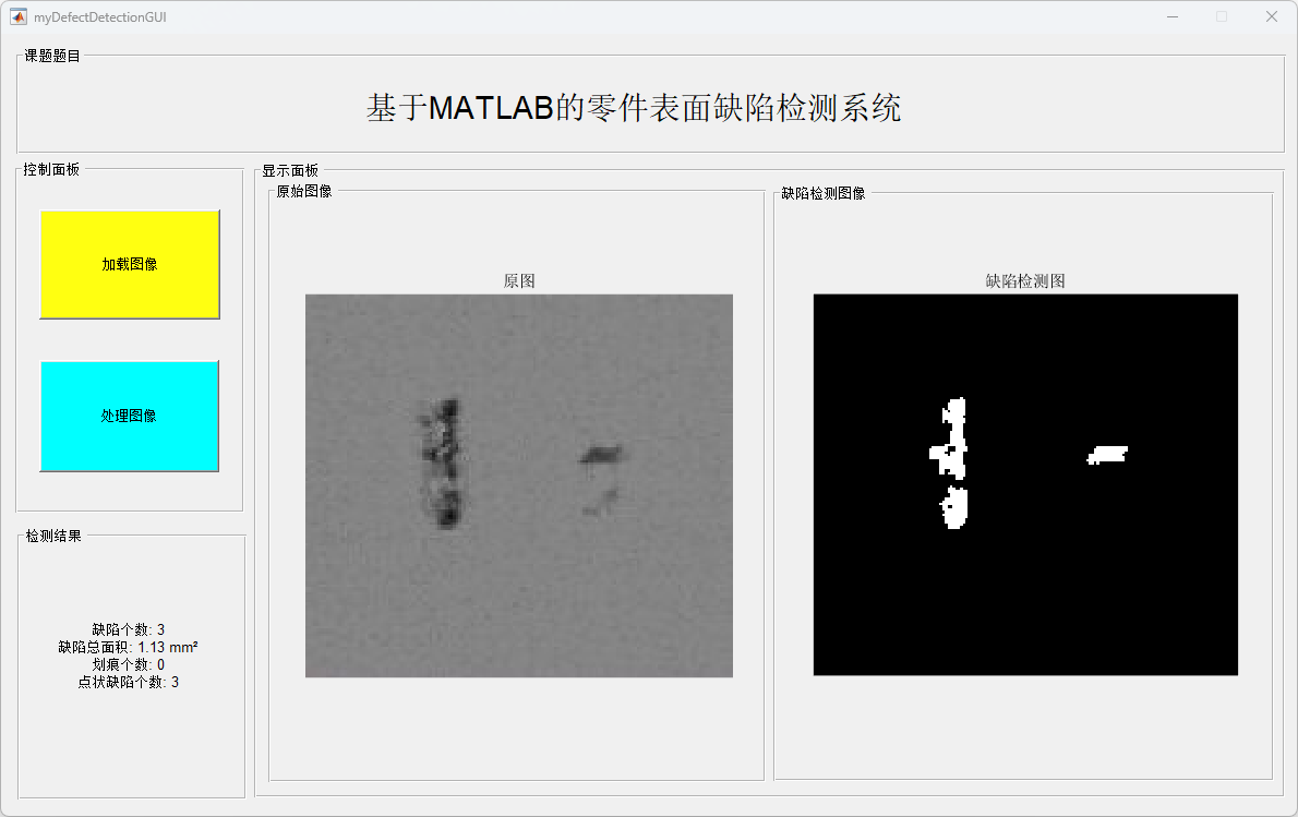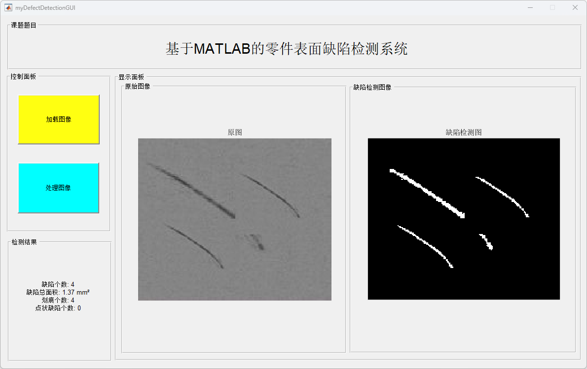 在此基础上,基于 MATLAB GUI 设计并实现了零件缺陷检测可视化系统。实验结果表明,该系统操作简单、运行稳定,能够有效完成零件表面缺陷的检测、分类与统计分析,具有一定的工程应用和教学参考价值。