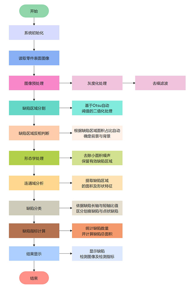 针对上述问题,提出了一种基于 MATLAB 的零件表面缺陷检测与分类方法。该方法首先对采集的零件图像进行灰度化与去噪预处理,采用 Otsu 自动阈值分割实现缺陷区域提取,并通过形态学操作去除小面积噪声。随后,利用连通域分析提取缺陷区域的面积和形状特征,根据长短轴比对缺陷进行分类,实现对划痕缺陷和点状缺陷的自动识别。同时,引入像素尺寸参数,对缺陷面积进行定量计算。