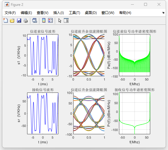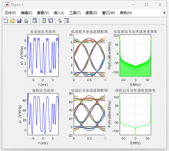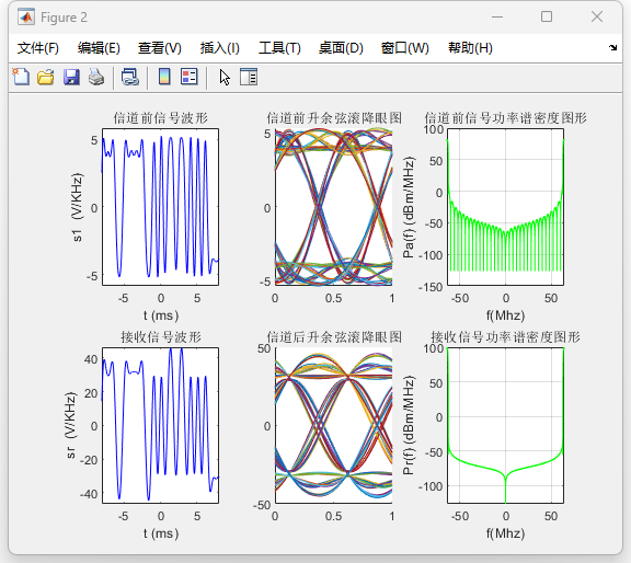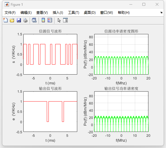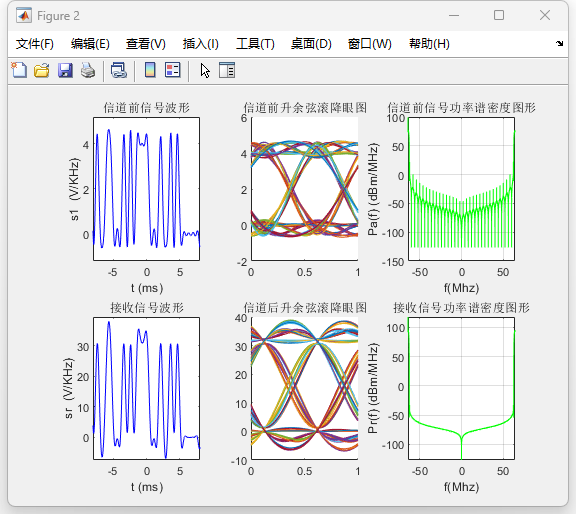 在所构建的系统中,发送端采用升余弦成形滤波器对基带信号进行带宽限制,信道模型引入加性高斯白噪声,接收端通过匹配滤波、定时抽样与判决过程实现信号恢复。利用傅里叶变换对信号在发送端、信道前后及接收端的功率谱密度进行了分析,并结合时域波形、频谱分布和眼图,对系统的时频特性及码间干扰情况进行了定量与定性分析。