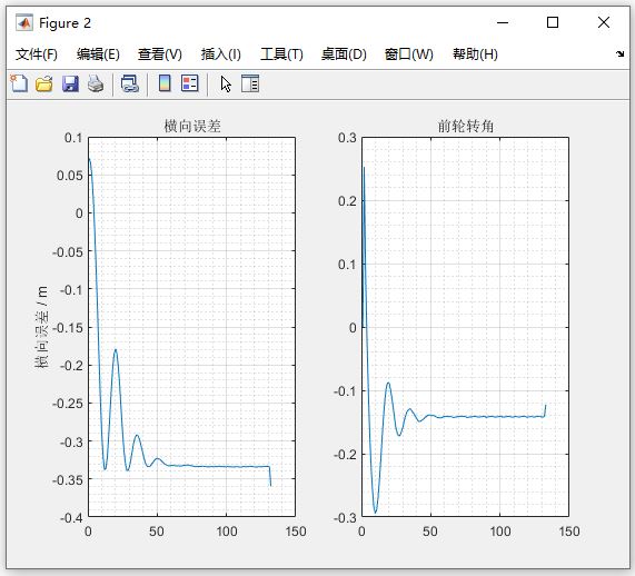 仿真结果表明,车辆横向误差在初始阶段出现一定振荡后逐渐收敛并保持稳定,同时前轮转角趋于平稳,说明系统具有较好的稳定性和收敛性。