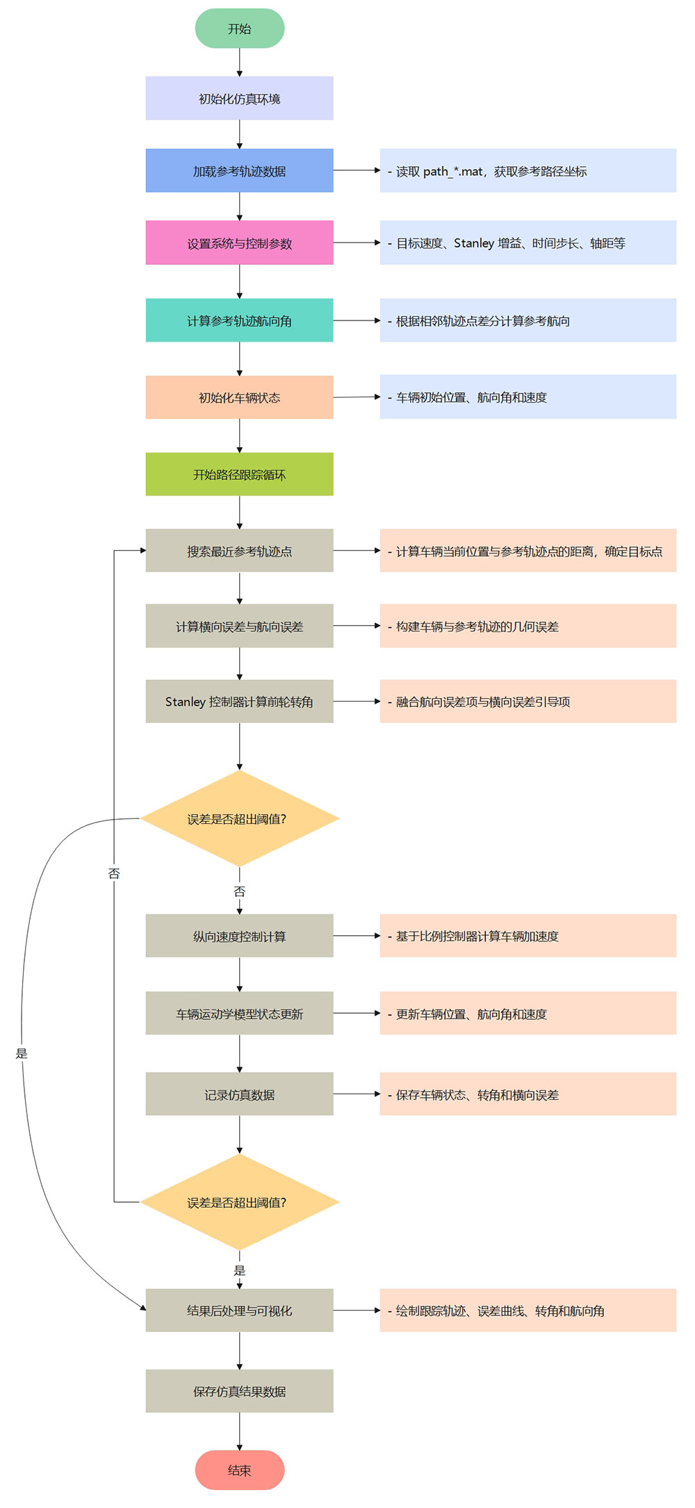 本系统基于车辆运动学自行车模型,采用 Stanley 前轮反馈控制算法实现车辆路径跟踪控制,并结合比例型纵向速度控制器,在 MATLAB 仿真环境下完成自动驾驶车辆的轨迹跟踪与性能验证。