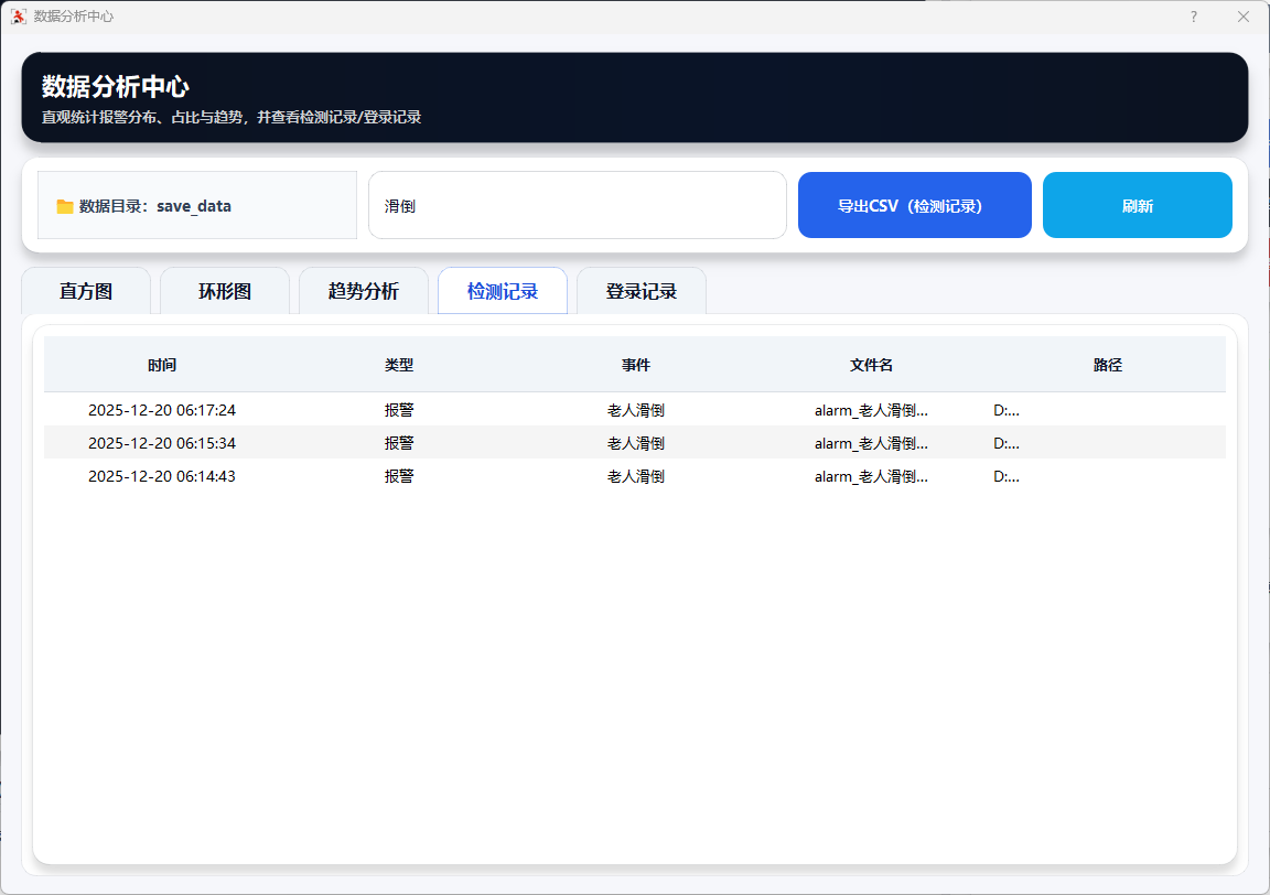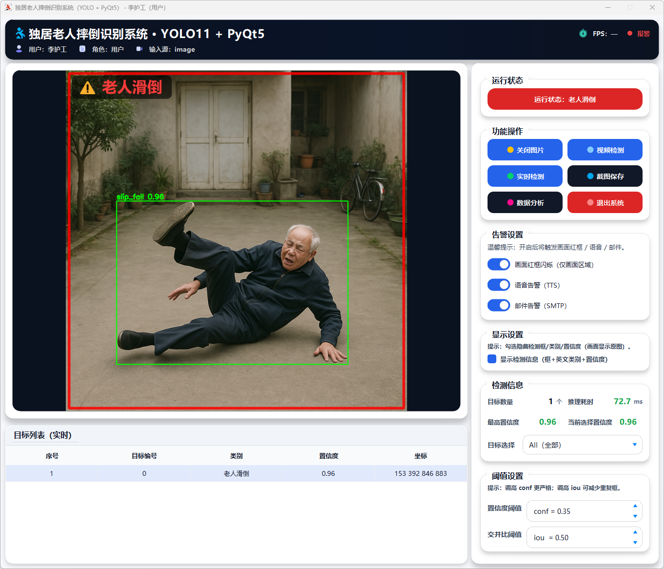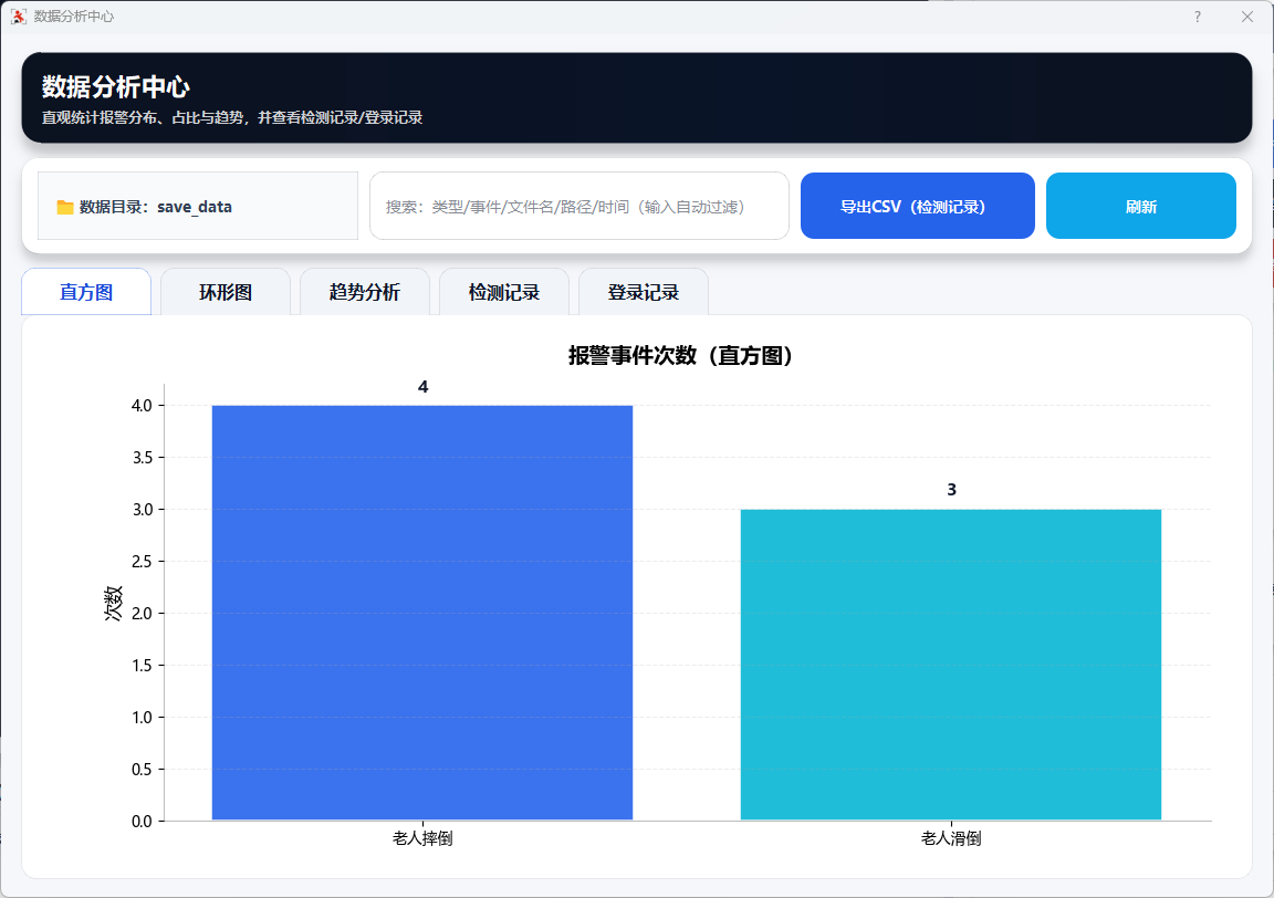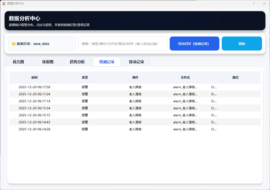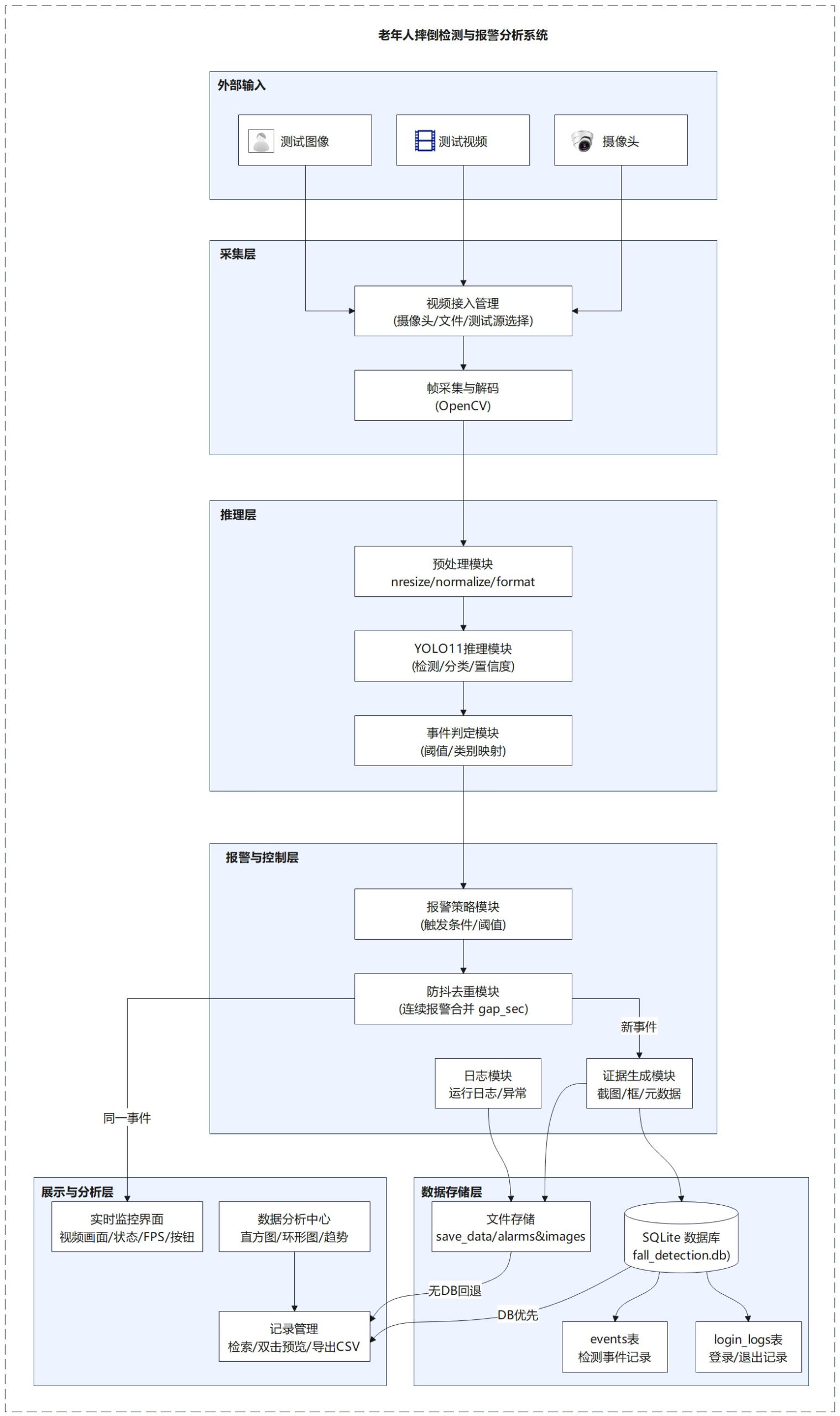 针对上述问题,本文提出并实现了一种基于深度学习目标检测模型 YOLOv11 的老人摔倒与滑倒检测系统。系统以视频流为输入,利用改进的目标检测网络对老年人关键行为进行实时识别,并结合置信度阈值和时间间隔约束对报警事件进行判定与控制,从而有效减少误检和重复报警。在系统实现方面,采用 PyQt5 构建桌面端可视化界面,实现视频监控、报警提示、图像存储与用户交互功能;同时引入 SQLite 数据库对检测事件与用户操作日志进行统一管理,并设计数据分析模块,对报警事件的类别分布、发生频率及时间趋势进行统计与可视化展示。