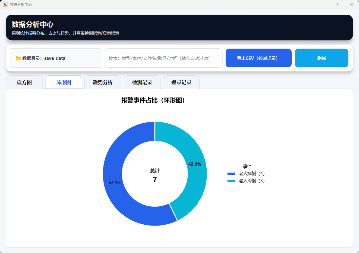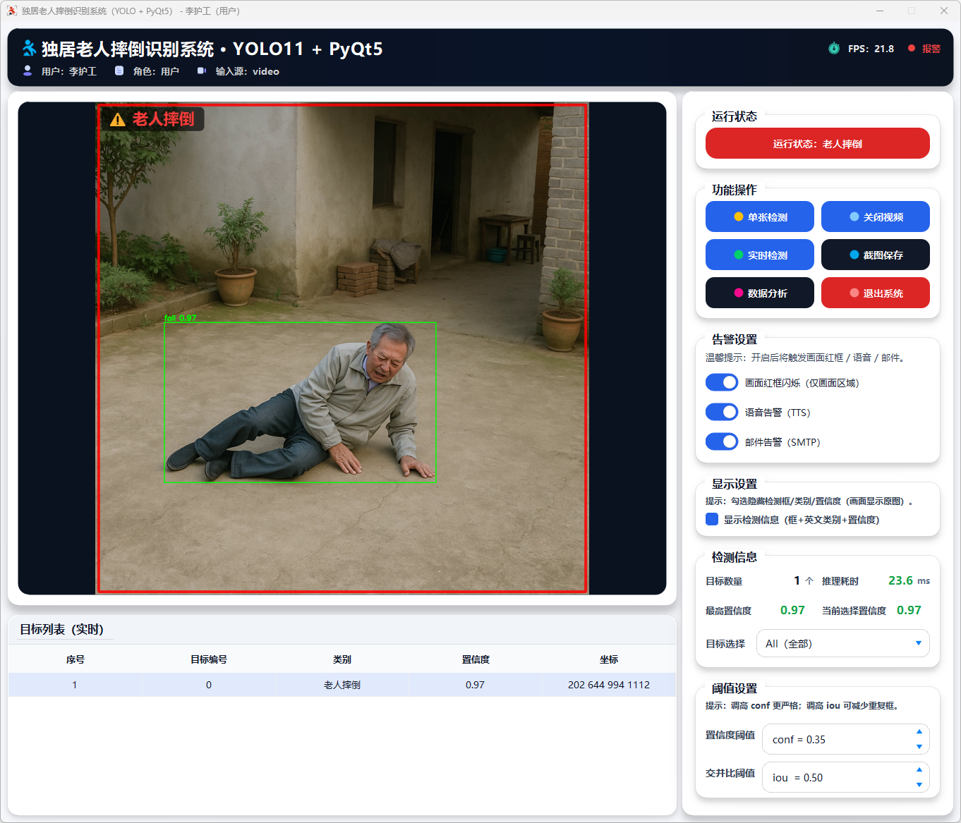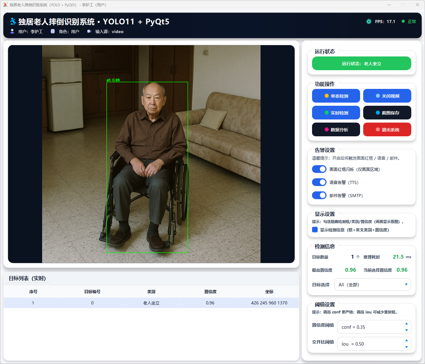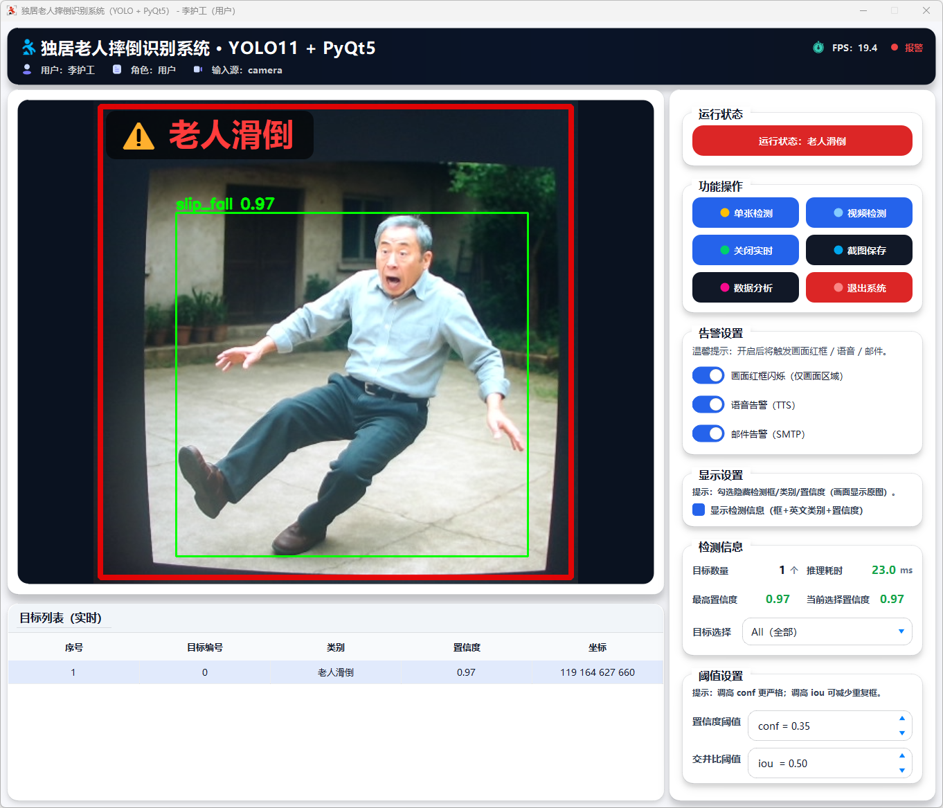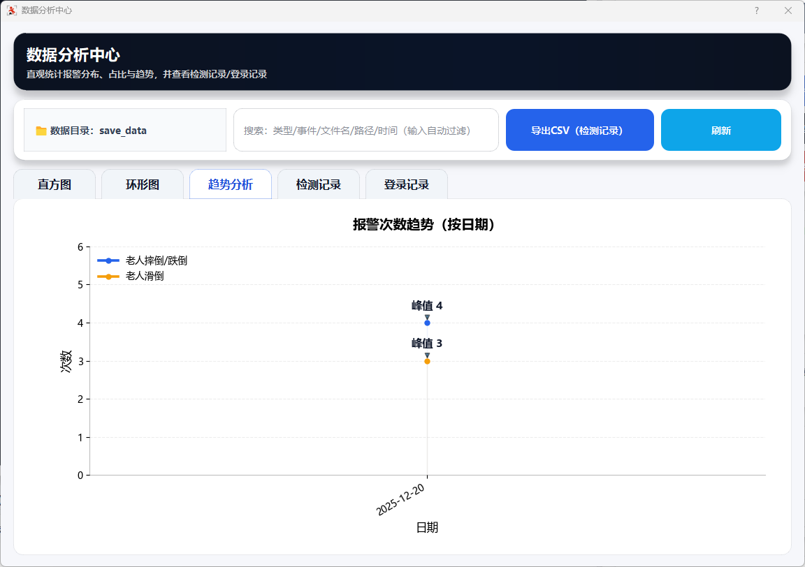 针对上述问题,本文提出并实现了一种基于深度学习目标检测模型 YOLOv11 的老人摔倒与滑倒检测系统。系统以视频流为输入,利用改进的目标检测网络对老年人关键行为进行实时识别,并结合置信度阈值和时间间隔约束对报警事件进行判定与控制,从而有效减少误检和重复报警。在系统实现方面,采用 PyQt5 构建桌面端可视化界面,实现视频监控、报警提示、图像存储与用户交互功能;同时引入 SQLite 数据库对检测事件与用户操作日志进行统一管理,并设计数据分析模块,对报警事件的类别分布、发生频率及时间趋势进行统计与可视化展示。