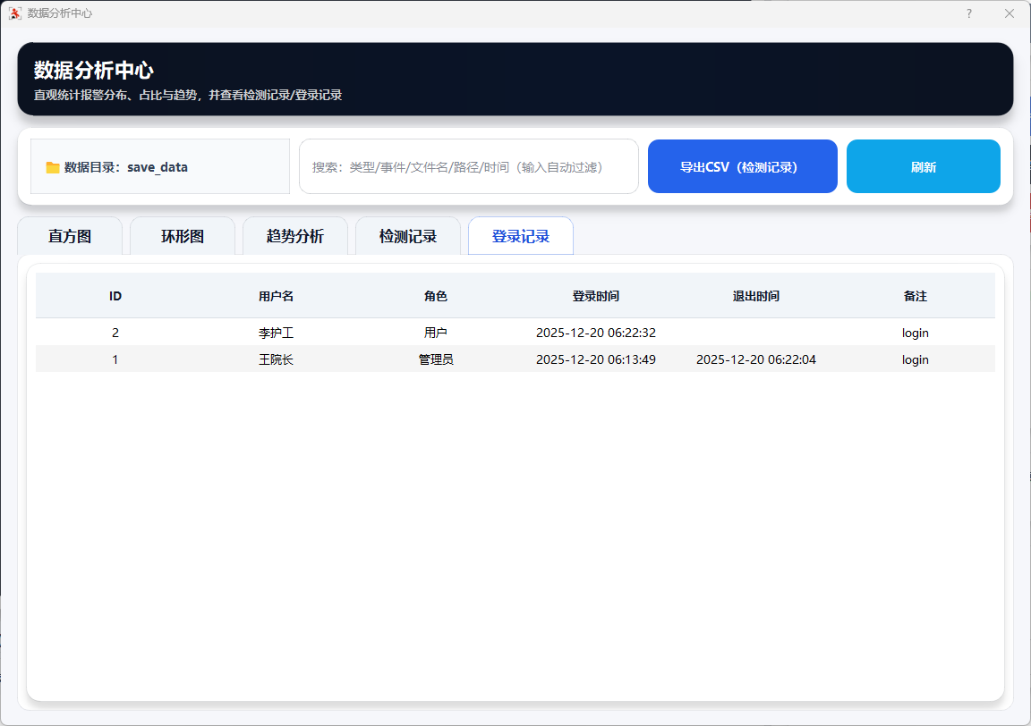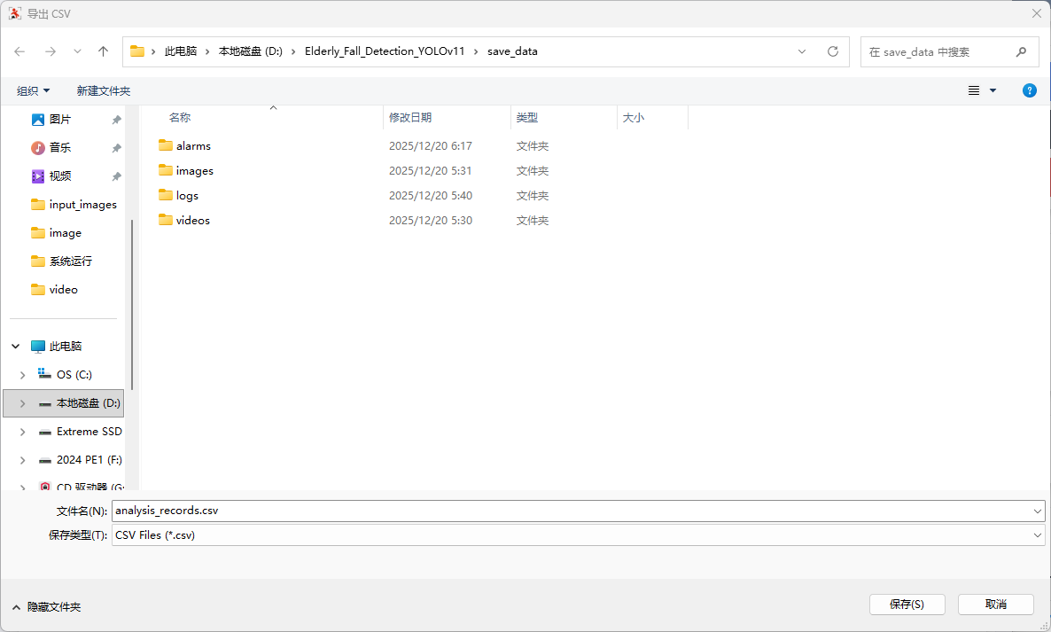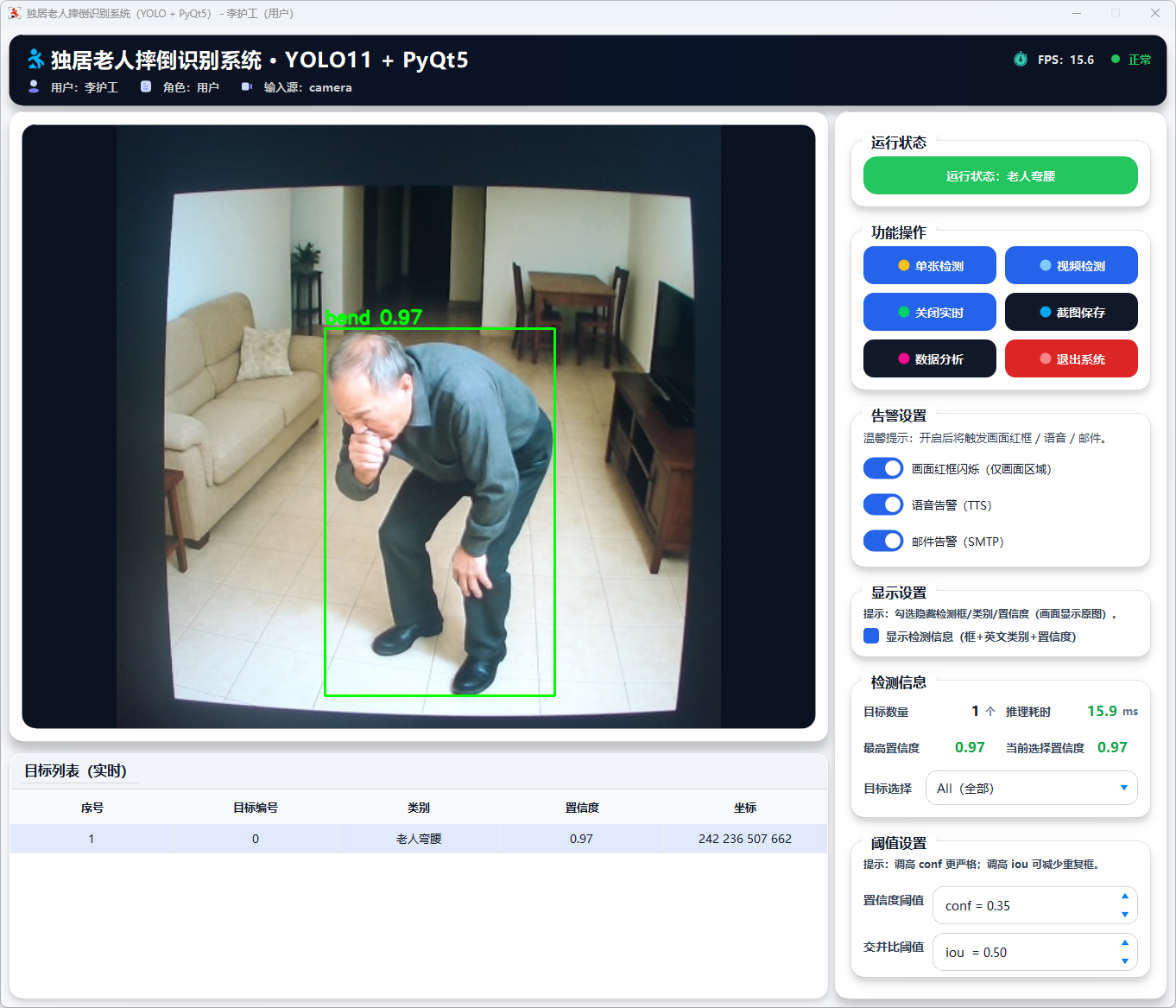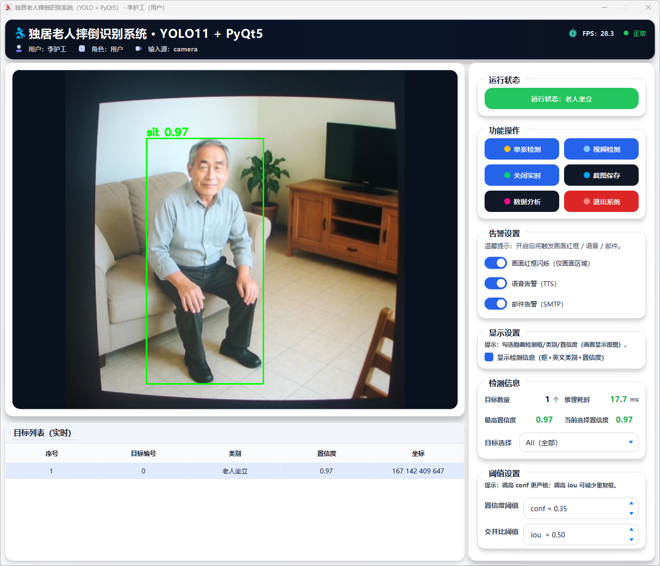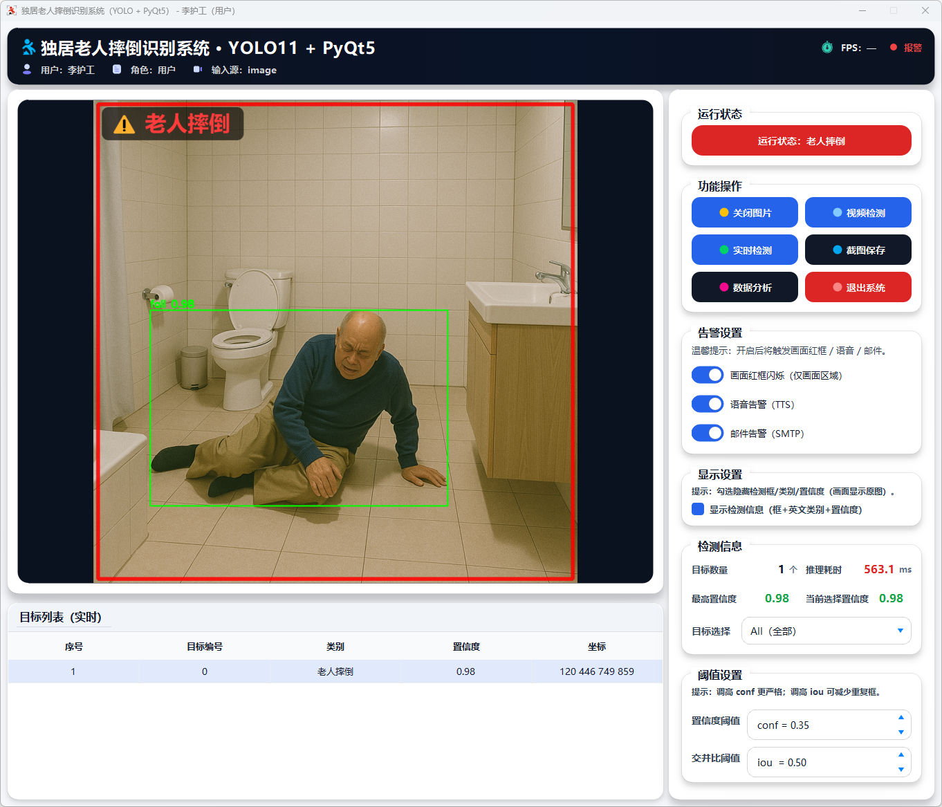 针对上述问题,本文提出并实现了一种基于深度学习目标检测模型 YOLOv11 的老人摔倒与滑倒检测系统。系统以视频流为输入,利用改进的目标检测网络对老年人关键行为进行实时识别,并结合置信度阈值和时间间隔约束对报警事件进行判定与控制,从而有效减少误检和重复报警。在系统实现方面,采用 PyQt5 构建桌面端可视化界面,实现视频监控、报警提示、图像存储与用户交互功能;同时引入 SQLite 数据库对检测事件与用户操作日志进行统一管理,并设计数据分析模块,对报警事件的类别分布、发生频率及时间趋势进行统计与可视化展示。