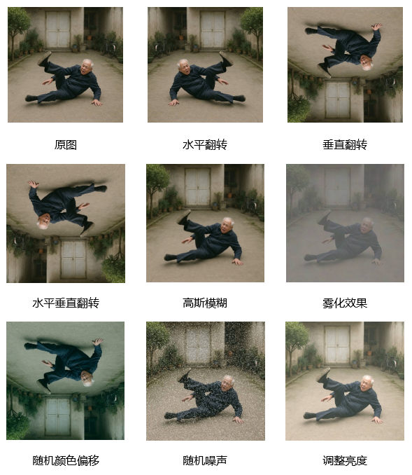 为提高老年人行为识别模型在复杂监控环境下的泛化能力与鲁棒性,本文在原始数据集的基础上引入多种图像数据增强策略,对训练样本进行扩展与扰动处理。通过对样本实施多样化的数据增强操作,可以有效缓解由于样本数量有限及场景单一所导致的模型过拟合问题,从而提升模型在实际应用场景中的检测稳定性与识别准确性。