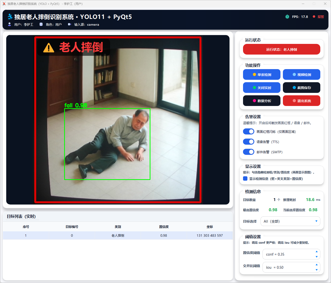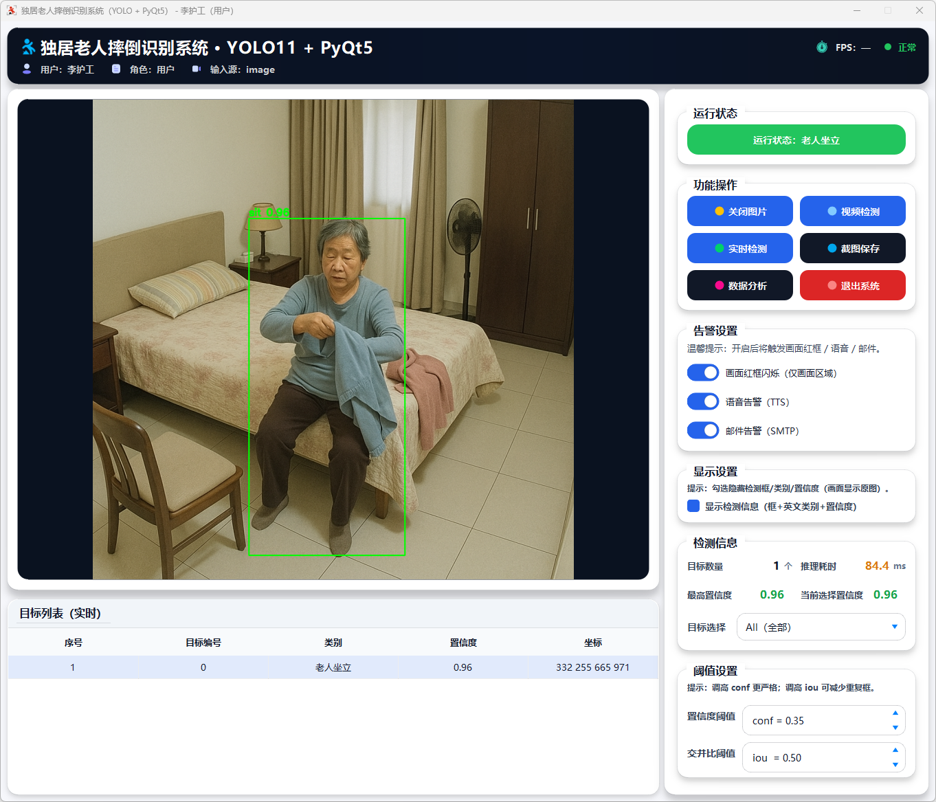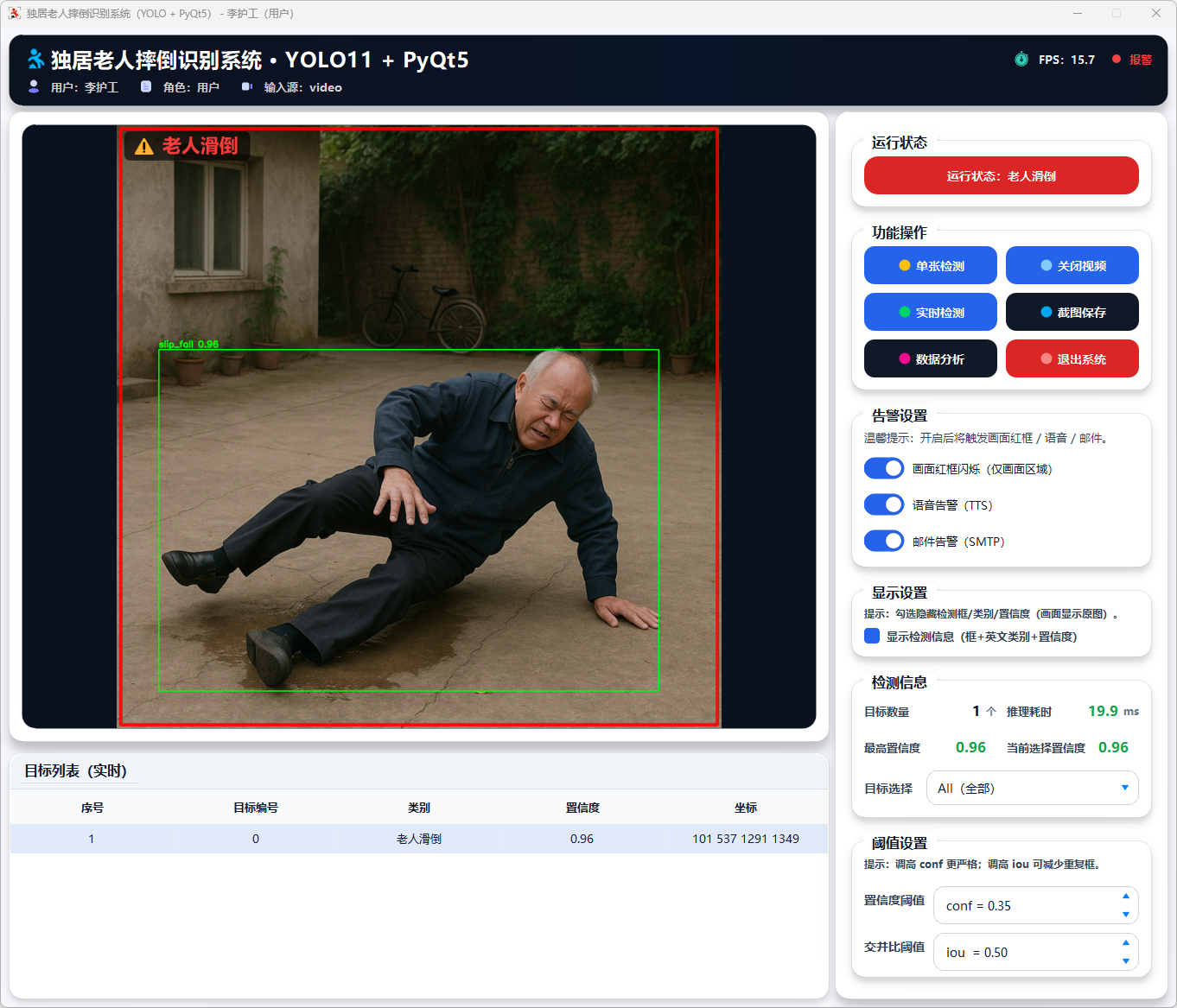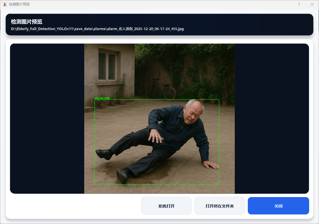 本系统采用基于 YOLOv11 的深度学习目标检测模型,对视频流中的老年人行为进行实时分析与识别,并结合桌面可视化界面、事件管理与数据分析模块,实现老年人摔倒与滑倒行为的自动检测、智能报警及统计分析功能。