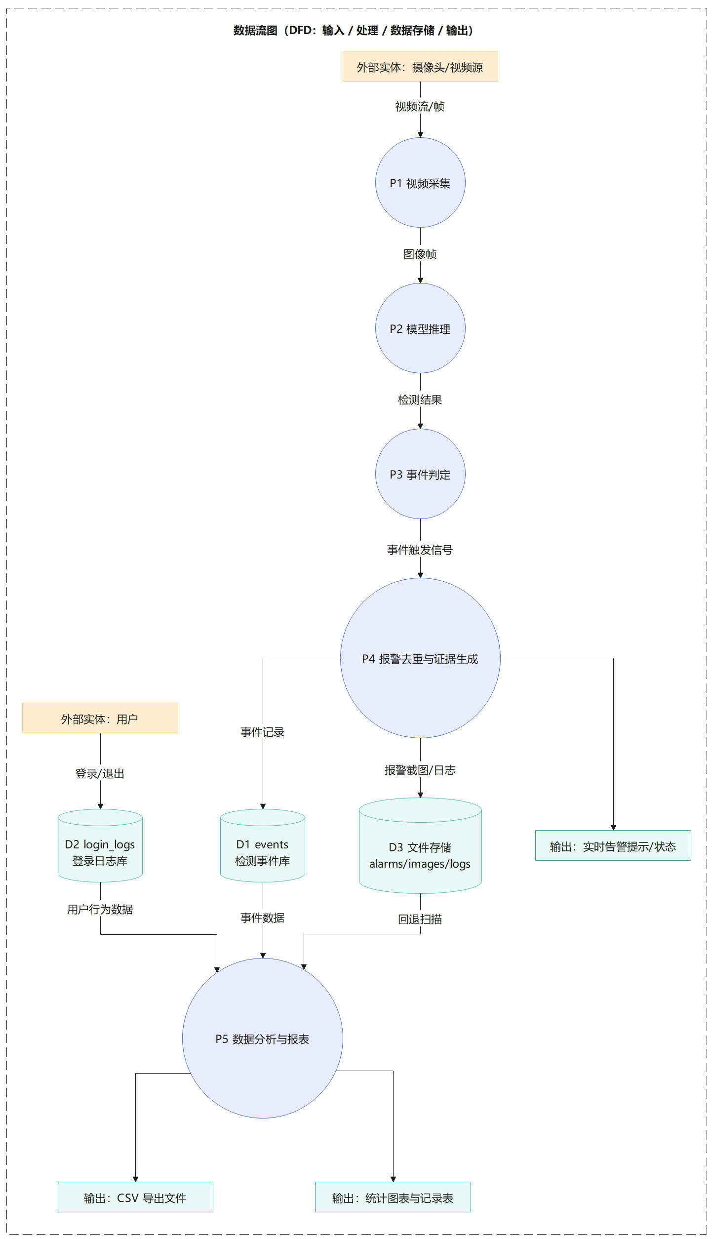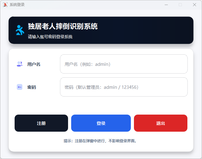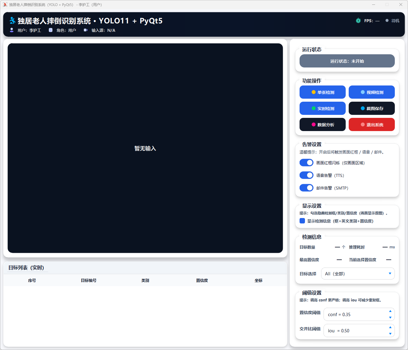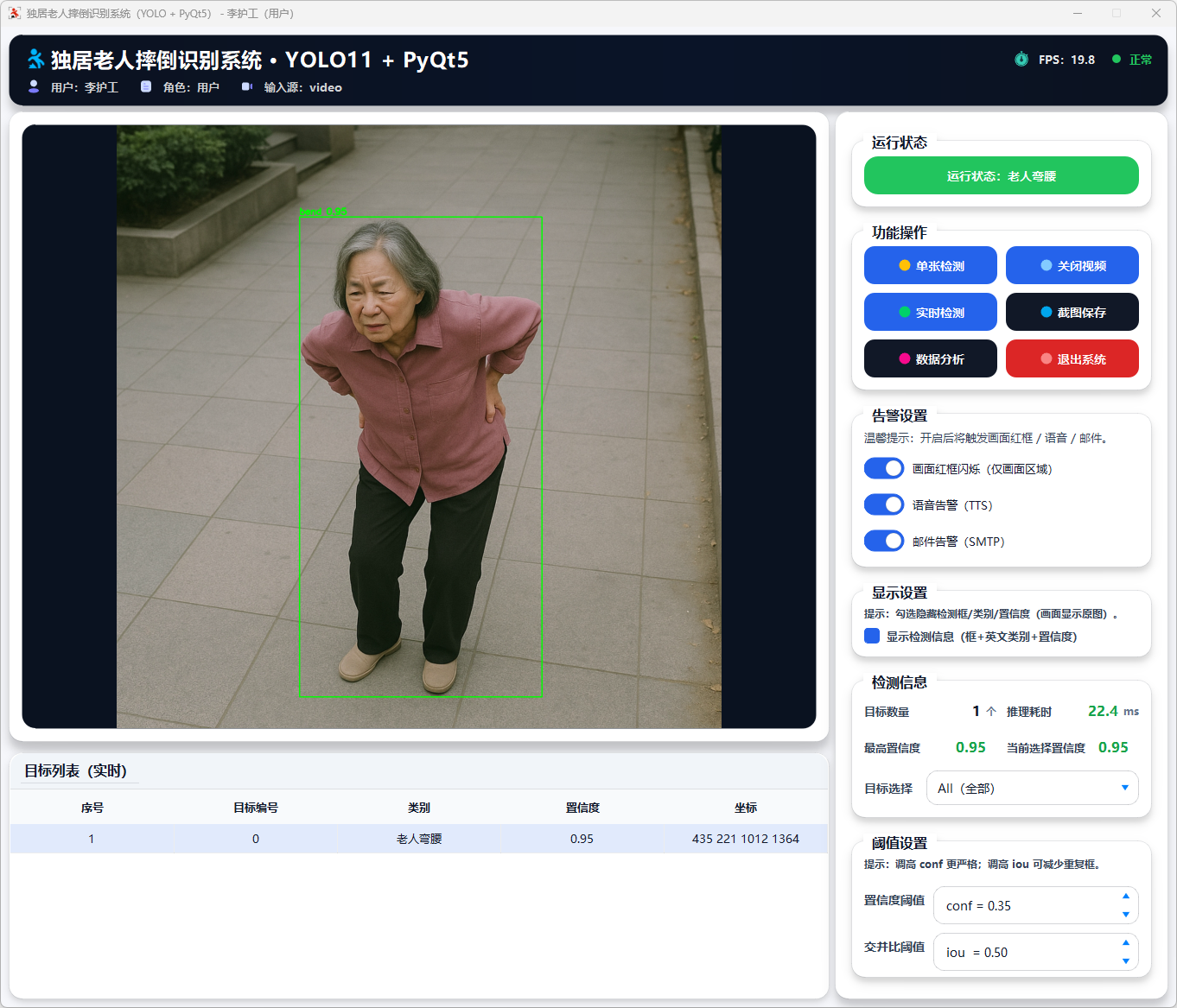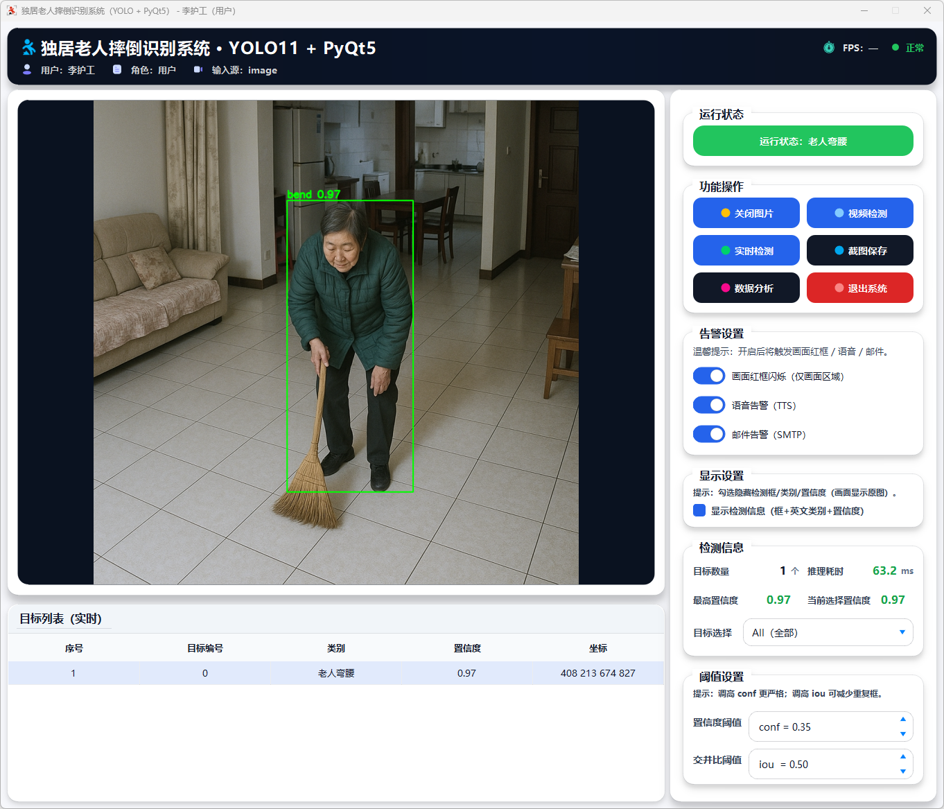 本系统采用基于 YOLOv11 的深度学习目标检测模型,对视频流中的老年人行为进行实时分析与识别,并结合桌面可视化界面、事件管理与数据分析模块,实现老年人摔倒与滑倒行为的自动检测、智能报警及统计分析功能。