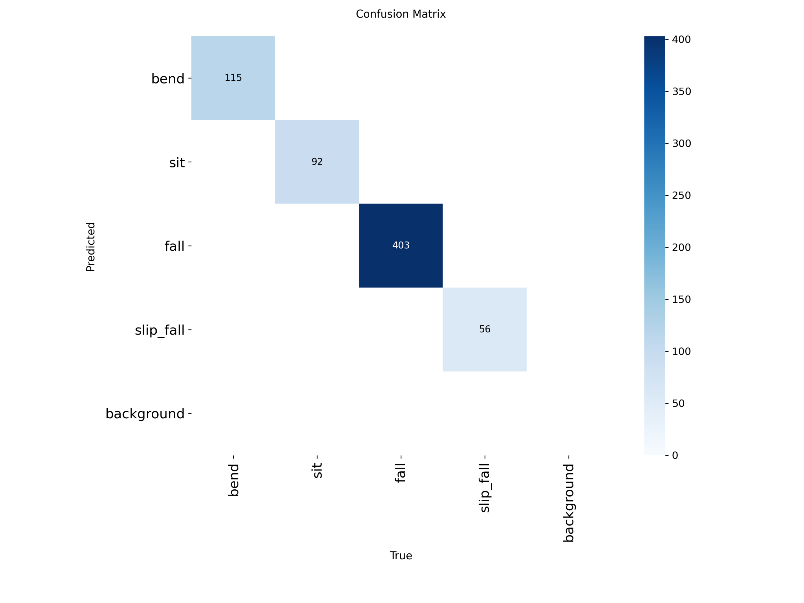 该混淆矩阵显示各类老年人行为样本主要集中于对角线位置,误分类现象较少,尤其在摔倒(fall)与滑倒(slip_fall)等关键异常行为上具有较高的识别准确率,表明模型具备良好的类别区分能力与整体识别性能。