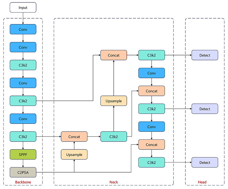 图中给出了YOLO11的整体网络结构,模型采用Backbone–Neck–Head的分层设计框架。Backbone负责特征提取,Neck通过多尺度特征融合增强对不同尺寸目标的感知能力,Head在多尺度特征图上进行预测输出,从而提高目标检测的精度与稳定性。