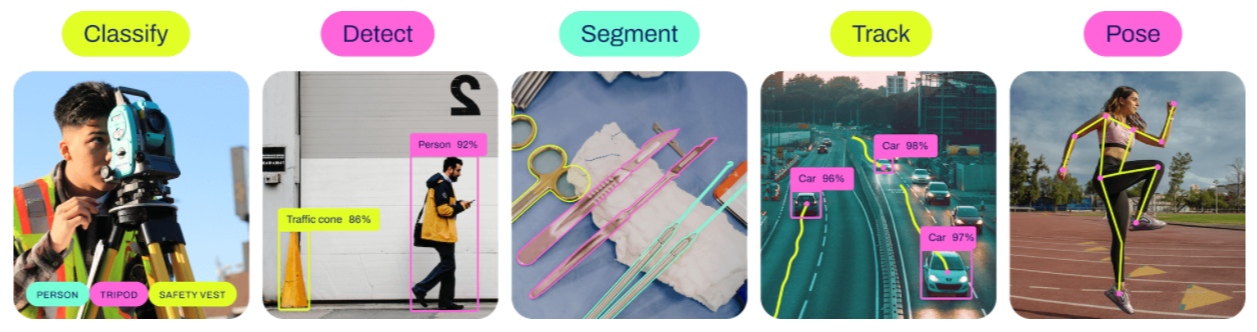 图中展示了YOLO11在统一框架下支持的多种计算机视觉任务,包括图像分类、目标检测、实例分割、目标跟踪以及姿态估计。该统一建模方式有效提升了模型的通用性与扩展能力,使 YOLO11 能够适配多样化的计算机视觉应用场景。