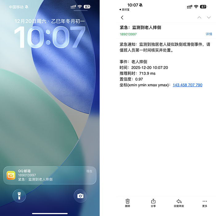 图28 实时检测:老人摔倒(画面红闪、语音告警、邮件通知)