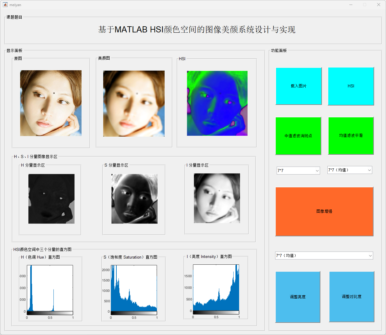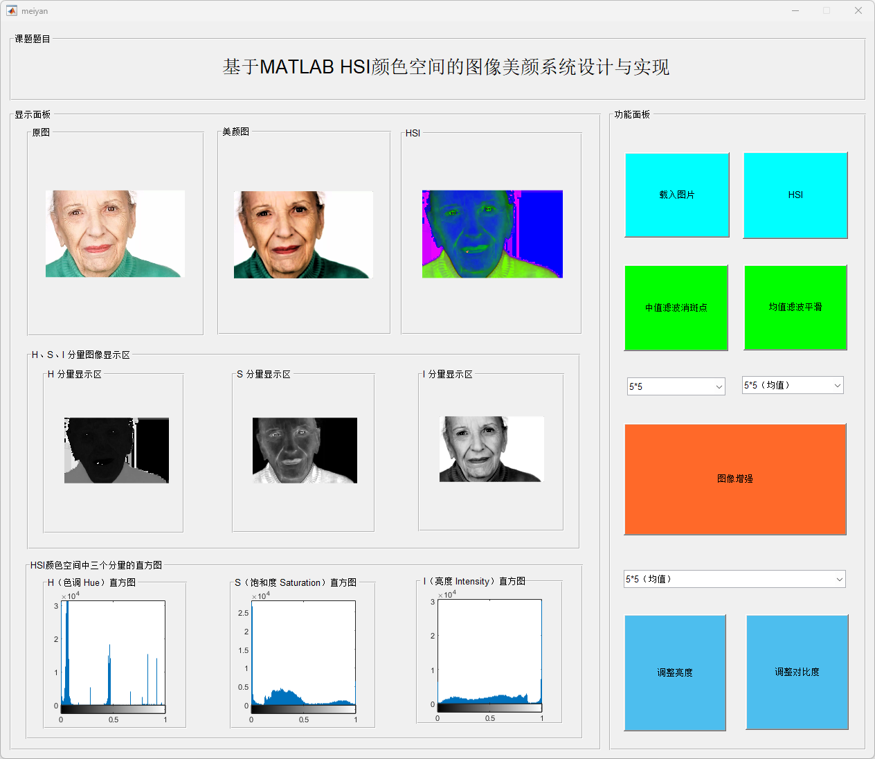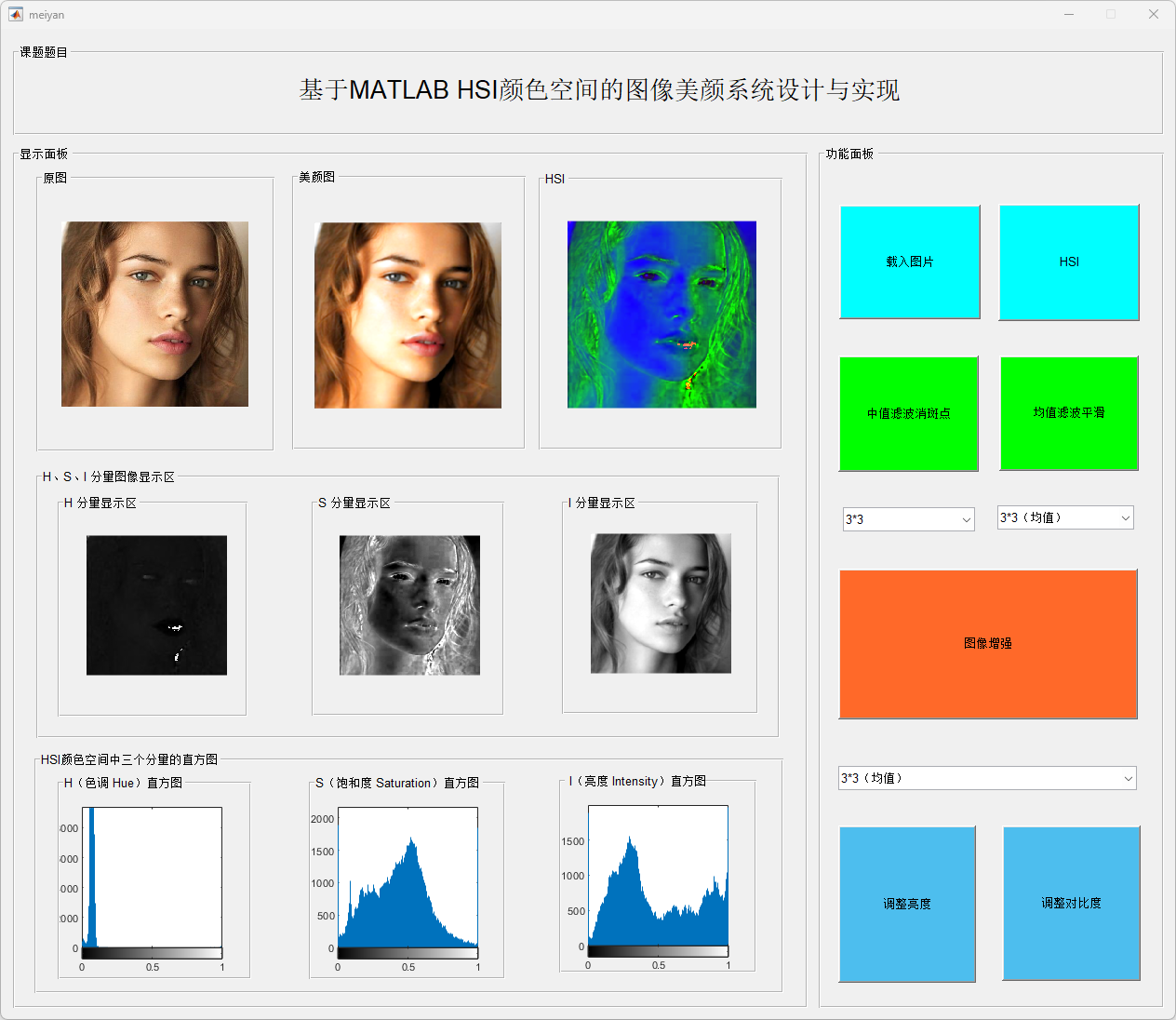 本系统基于 MATLAB 平台,采用 HSI 颜色空间对彩色图像进行分量分解与处理,通过对亮度和饱和度分量的增强及滤波操作,实现图像美颜效果,并以图形用户界面的形式完成系统功能设计与实现。