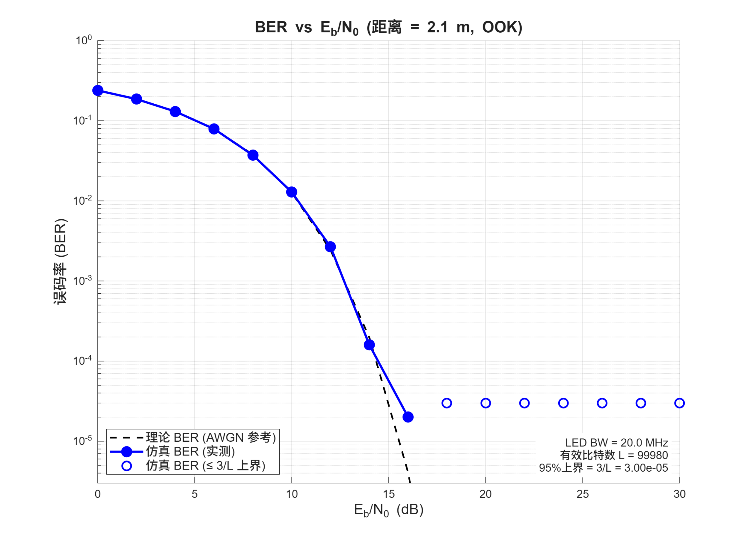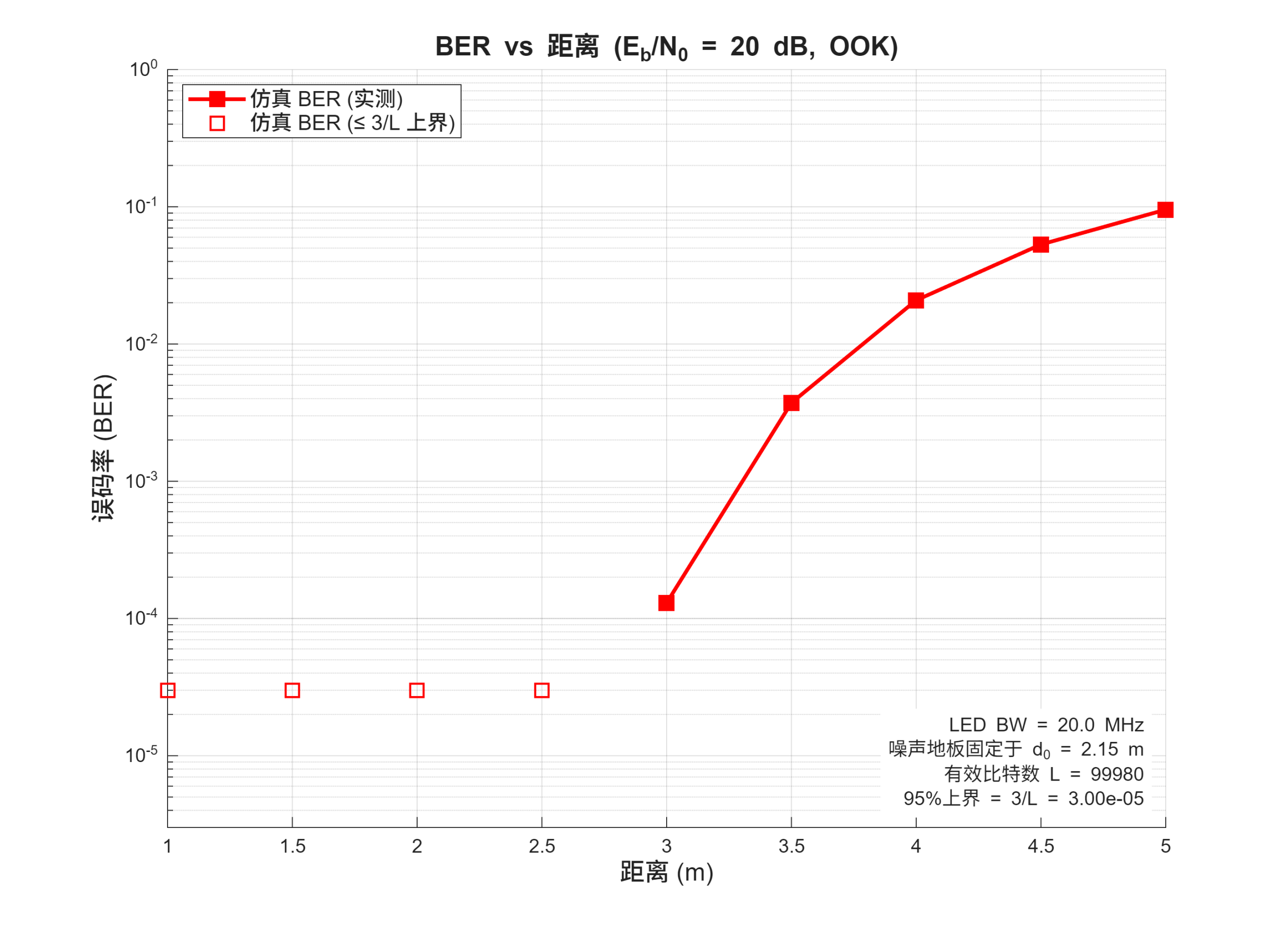 在所构建的系统模型中,发射端采用单极性 OOK 强度调制方式,并考虑 LED 有限带宽引入的低通特性;信道部分采用 Lambertian 辐射模型对室内直射光链路进行建模;接收端基于光电探测器进行电流域信号检测,并结合背景光电流与加性高斯噪声进行建模。为避免噪声功率随信道增益变化而引入的混淆,本文引入了一种参考噪声地板方法,即在参考距离处按给定 𝐸𝑏/𝑁0对噪声强度进行标定,并在距离扫描过程中保持噪声功率不变,从而更加直观地分析链路衰减对系统性能的影响。