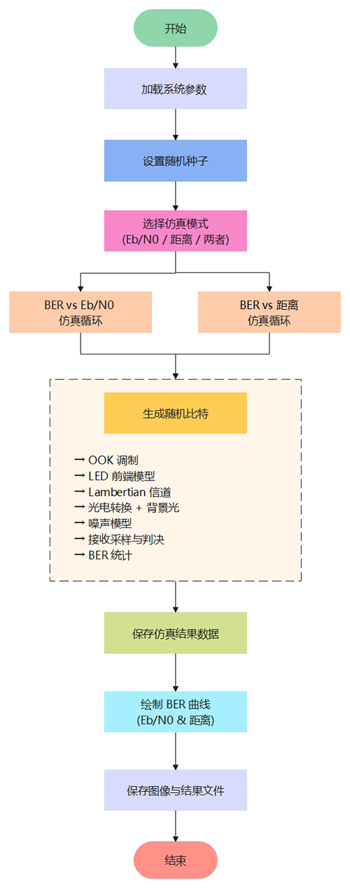 本文构建了一种基于 Lambertian 直射信道模型的室内可见光通信系统仿真模型,采用 OOK 强度调制与直接检测方式,并在参考距离处进行噪声标定以分析系统误码率性能。