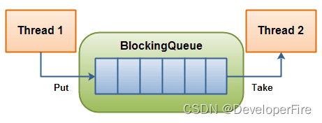 BlockingQueue 通常用于一个线程生产对象,而另外一个线程消费这些对象的场景。下图是对这个原理的阐述: