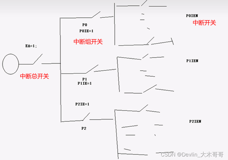 要使用中断功能,首先要开启CPU的中断功能,中断功能的开启是逐级管理模式。本文以外部中断为例,如下图,只有对应的逐级开关都被开启时,才能开启对应的中断功能。其他类型的中断开启类似。