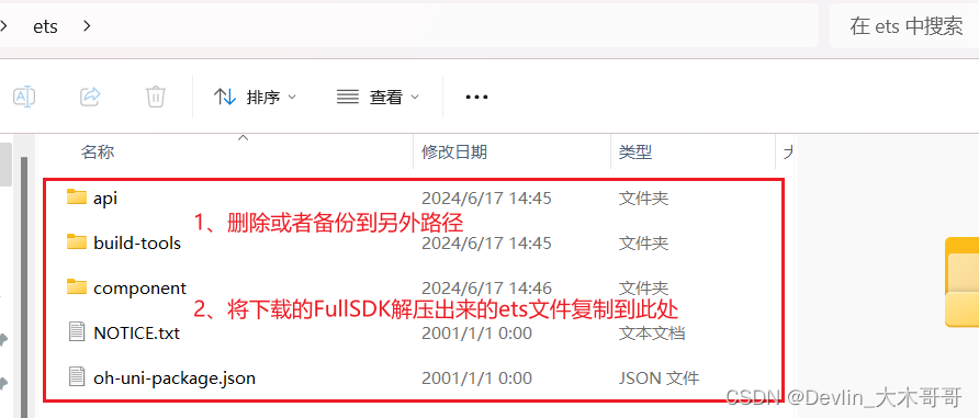 (1)将本地的ets文件的内容进行删除或者在备份到另外的路径,删除原SDK目录中的所有文件(否则可能会导致文件无法全部覆盖),将下载的FullSDK解压出来的ets文件复制到此处,进行替换。