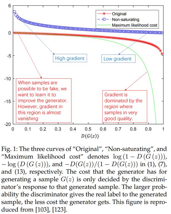 实际上,公式 (1) 可能无法为 G 提供足够大的梯度使其很好地学习。一般来说,G 在学习过程的早期性能很差,产生的样本与训练数据有明显的差异。因此,D 可以以高置信度拒绝 G 生成的样本。在这种情况下,log(1-D(G(z))) 是饱和的。我们可以训练 G 以最大化 log(D(G(z))),而非最小化 log(1-D(G(z)))。生成器的损失则变为