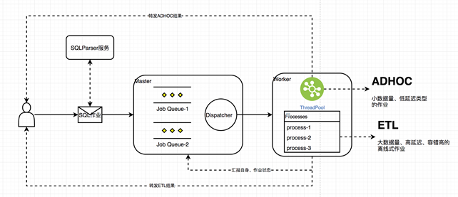 Worker:负责执行 ETL 和数据文件导出类型的作业,拉起 AdhocWorker 进程(Adhoc 任务在 AdhocWorker 进程中的线程池中执行),ETL 类型的作业通过子进程的方式完成;