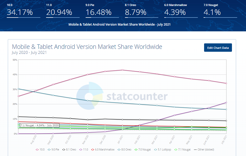 全球移动和平板电脑 Android 版本市场份额 - 2021 年 7 月