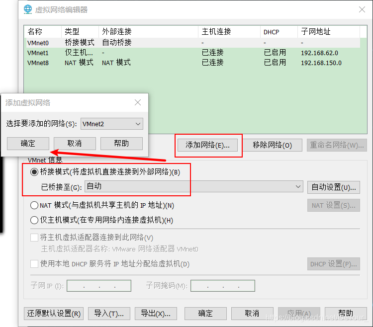 1、我选用桥接模式,之前虚拟机网络适配器种我没有配置桥接模式。(打开虚拟网络编辑器,添加网络,然后选择桥接模式即可(我添加的是VMnet0,名字是什么不重要))