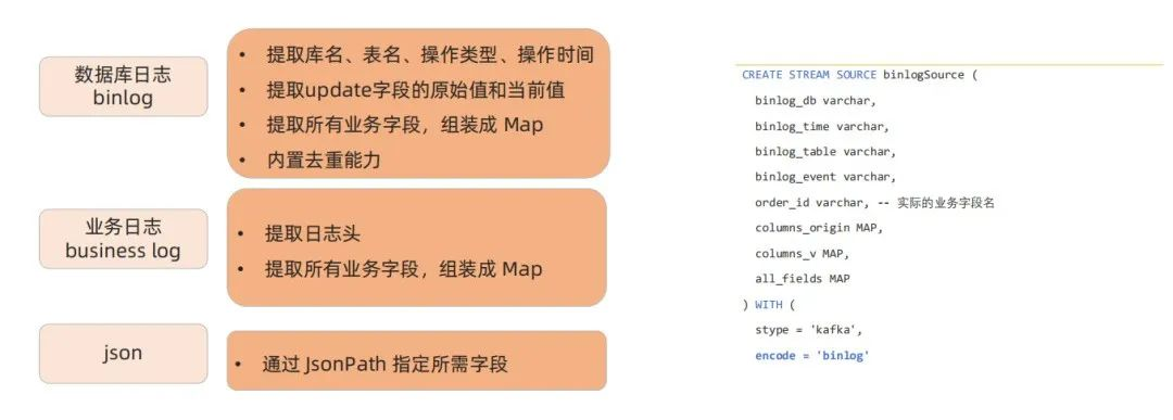 用户消费数据后需要将数据进行提取,但数据格式往往非常复杂,如数据库日志 binlog,每个用户单独实现,难度较大。StreamSQL 将提取库名、表名、提取列等函数内置,用户只需创建 binlog 类型 source。并内置了去重能力。