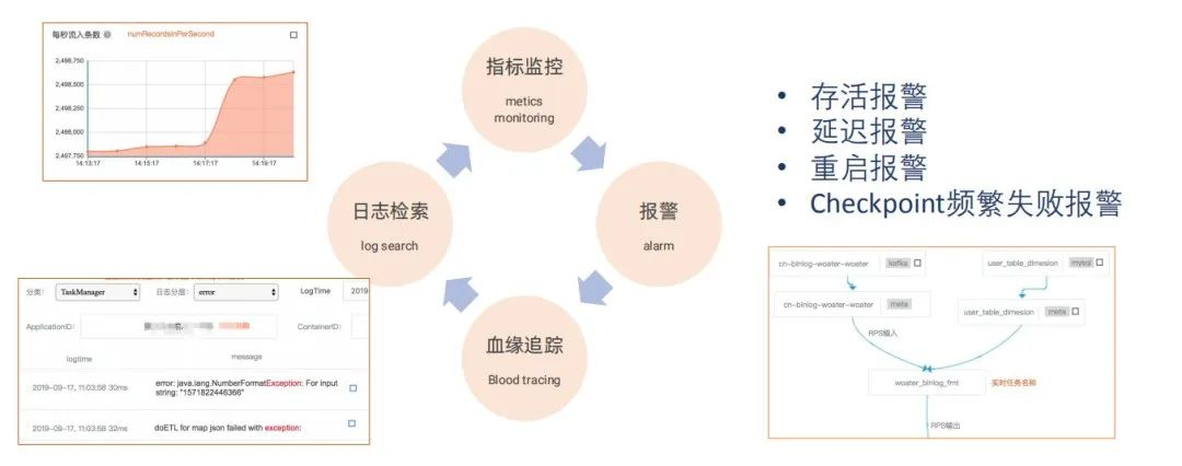 3、报警:报警需要做一个平衡,如重启报警有多类如 ( 机器宕机报警、代码错误报警 ),通过设置一天内单个任务报警次数阈值进行平衡,同时也包括存活报警 ( 如 kill、start )、延迟报警、重启报警和 Checkpoint 频繁失败报警 ( 如 checkpoint 周期配置不合理 ) 等。