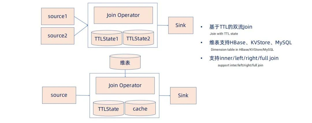 在滴滴的流计算业务中有的 join 操作数据对应的跨度比较长,例如顺风车业务发单到接单的时间跨度可能达到一个星期左右,如果这些数据的 join 基于内存操作并不可行,通常将 join 数据放在状态中,窗口通过 TTL 实现,过期自动清理。