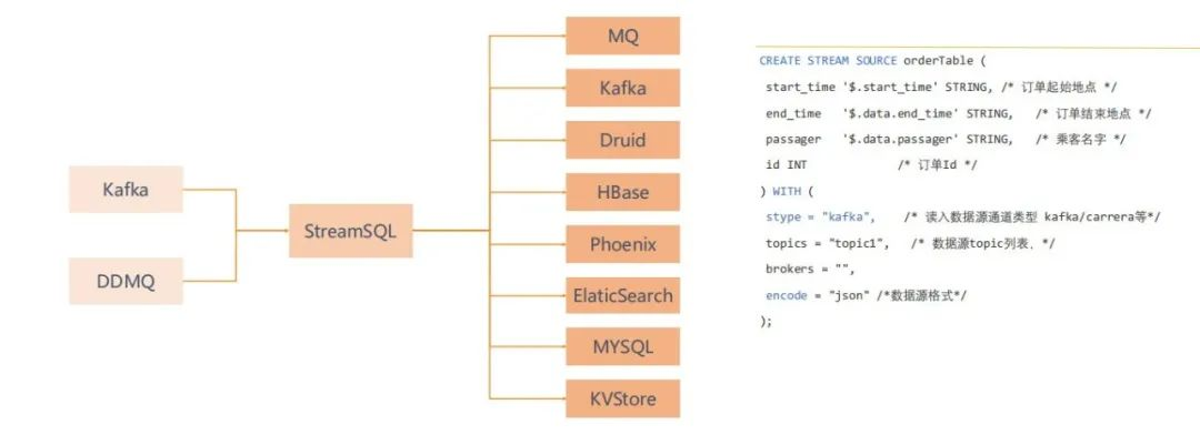 包括上游的消息队列、下游的消息队列和各种存储如 Druid、HBase 都进行了打通,用户方只需要构建一个 source 就可以将上游或者下游描述出来。