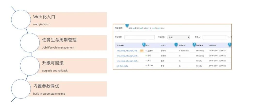滴滴的所有流计算全部是通过 Web 化入口进行提交,提供了整个任务生命周期管理,包括任务提交、任务停止、任务升级和回滚。同时只需要在 web 化服务台进行参数修改即可实现对内置参数 ( 如 task manager memory 等 ) 进行调优。