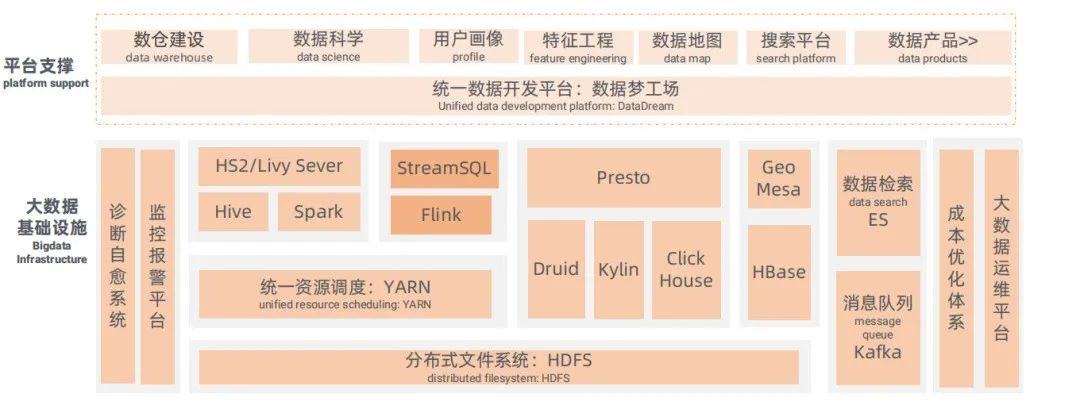 滴滴基于开源的生态构建了比较完整的大数据体系,包括离线、实时系统,如 HBase 生态、数据检索 Elastic Search、消息队列 Kafka 等。在 Flink 基础上滴滴主要发展StreamSQL,之后会有详细介绍。