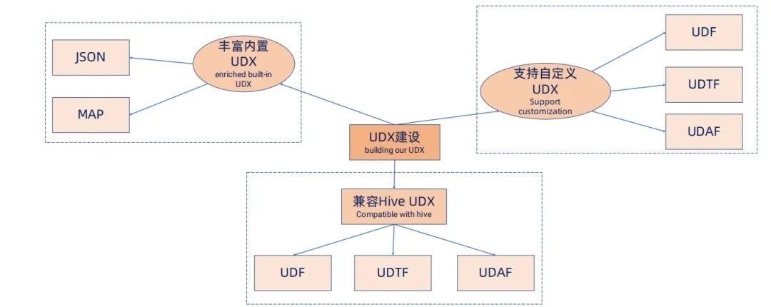 丰富内置 UDX,如对 JSON、MAP 进行了扩展,这些在滴滴业务使用场景中较多。支持自定义 UDX,用户自定义 UDF 并使用 jar 包即可。兼容 Hive UDX,例如用户原来是一个 Hive SQL 任务,则转换成实时任务不需要较多改动,有助于批流一体化。