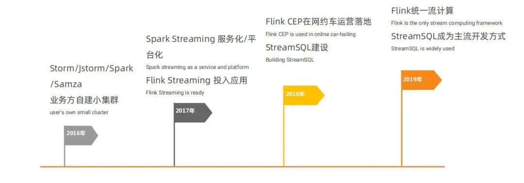 在2017年之前,滴滴流计算主要依靠业务方自建小集群的方式,技术选型也多种多样,包括 Storm、jstrom、Spark、Samza 等。2017年开始进行业务收敛,保留了8个 Spark Streaming 并构建了一个平台化、服务化的大集群,并且引入了 Flink。引入 Flink 的原因是部分业务对实时性要求较高,Spark Streaming 无法支持。2018年滴滴构建了基于 Flink SQL 的名为 StreamSQL 的 SQL 化服务,并且使用 Flink CEP 解决了一些网约车实时运营问题。2019年,滴滴完成了流计算引擎的统一,绝大部分任务以 Flink 为基础,通过 StreamSQL 开发流计算任务成为主流开发方式,达到了50%以上。