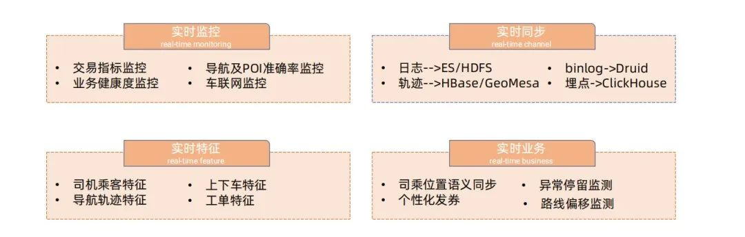 实时业务:实时业务会影响业务行为,包括司乘位置语义同步 ( 接单过程中司机可以实时知道乘客位置变化、乘客也可以知道司机位置变化 )、异常停留监测、高危行程监测、个性化发券、路线偏移监测等。