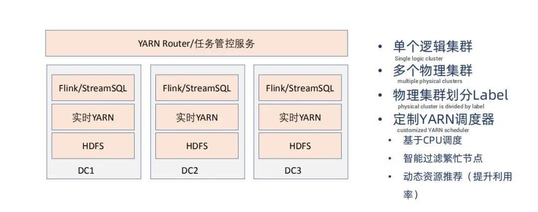 ▪ 在 YARN 的基础上构建了路由层。路由层的职责是屏蔽多个物理集群,对业务方提供单一的逻辑集群。通过 YARN 上 queue 的划分来决定业务运行在机房的不同集群上。