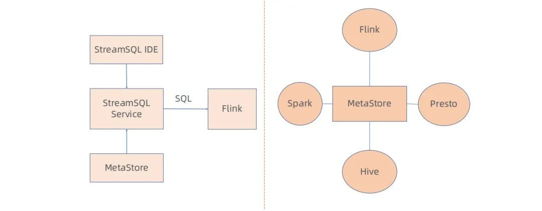 虽然 Flink 具备批流一体化能力,但滴滴目前并没有完全批流一体化,希望先从产品层面实现批流一体化。通过 Meta 化建设,实现整个滴滴只有一个 MetaStore,无论是 Hive、Kafka topic、还是下游的 HBase、ES 都定义到 MetaStore 中,所有的计算引擎包括 Hive、Spark、Presto、Flink 都查询同一个 MetaStore,实现整个 SQL 开发完全一致的效果。根据 SQL 消费的 Source 是表还是流,来区分批处理任务和流处理任务,从产品层面上实现批流一体化效果。