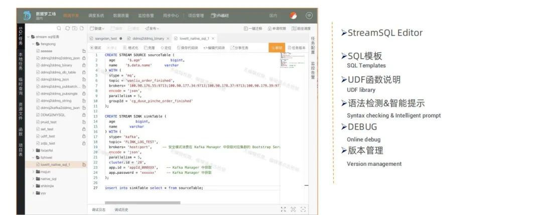滴滴对于 StreamSQL 构建了 StreamSQL IDE,除了基本的 StreamSQL editor 外,还主要包含多个其他功能: