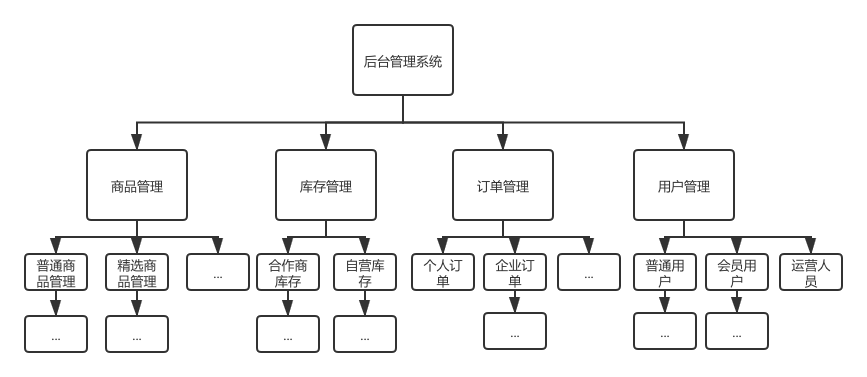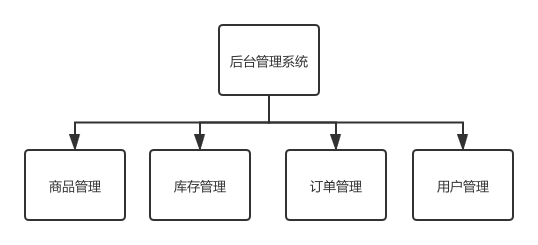 后来随着业务越做越大,商品管理逐渐分成了精选商品管理和普通商品管理,库存管理分成了合作商库存和自营库存,订单管理和用户管理也愈发的庞大,成了这个样子:
