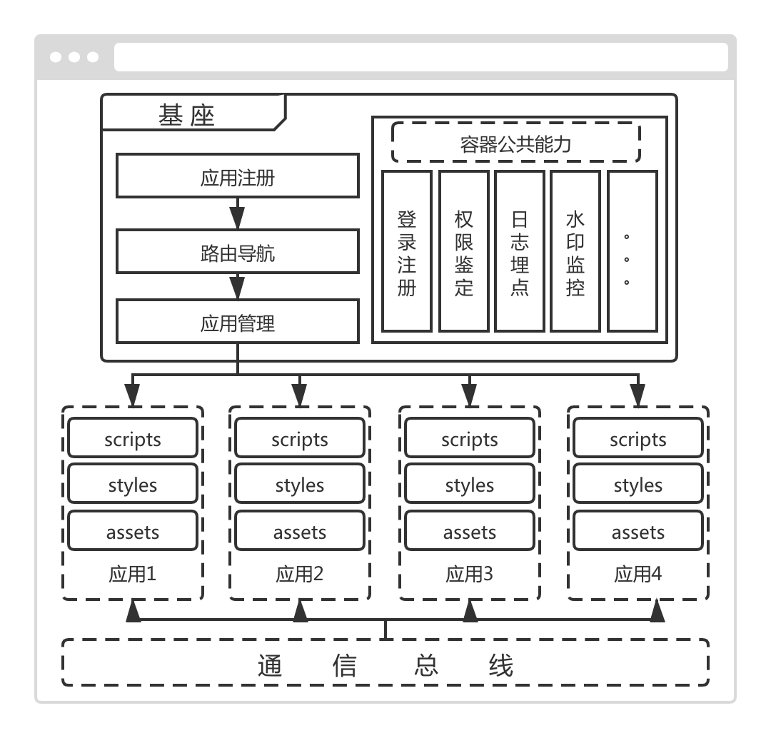 这样,从产品维度来看,所有的系统都内聚在一个基系统中,用户只需要一次登录就可以不刷新的切换各个系统,所有功能都内聚在一起,有效提高了运营效率;从技术维度来看,各个系统并不需要进行技术栈的重构,依然可以沿用原有技术栈,每个团队依然各自维护各自的代码库,独立部署独立上线,且可以共用一些通用的能力如登录、鉴权、打点、日志分析等,即保证了遗留系统的迁移,又聚合了前端应用,完美解决应用臃肿情况下如何各自治理的问题。