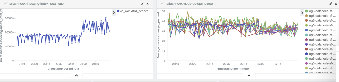 我们去分析这些延迟问题的时候,发现了一些不太好解释的现象。之前做性能测试时,ES节点cpu利用率能超过80%,而生产环境延迟索引所在的节点cpu资源只使用了不到50%,集群平均cpu利用率不到40%,这时候IO和网络带宽也没有压力。通过提升写入资源,写入速度基本没增加。于是我们开始一探究竟,我们选取了一个索引进行验证,该索引使用10个ES节点。从下图看到,写入速度不到20w/s,10个ES节点的cpu,峰值在40-50%之间。