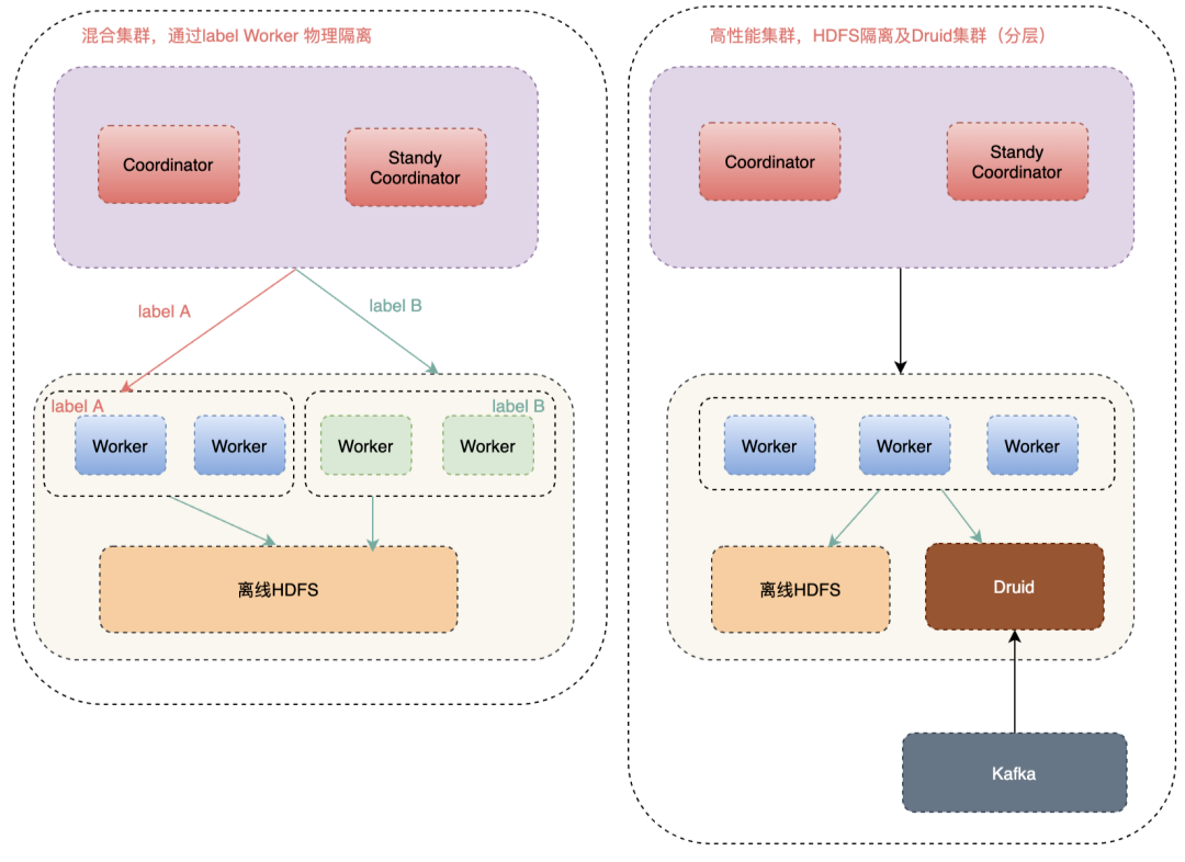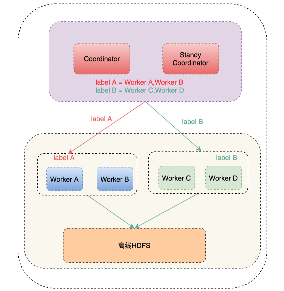 根据不同的业务划分不同的label,通过配置文件配置业务方指定的label和其对应的机器列表,Coordinator会加载配置,在内存里维护集群label信息,同时如果配置文件里label信息变动,Coordinator会定时更新label信息,这样调度时根据SQL指定的label信息来获取对应的Worker机器,如指定label A时,那调度机器里只选择Worker A 和 Worker B 即可。这样就可以做到让机器物理隔离了,对性能要求高的业务查询既有保障了。