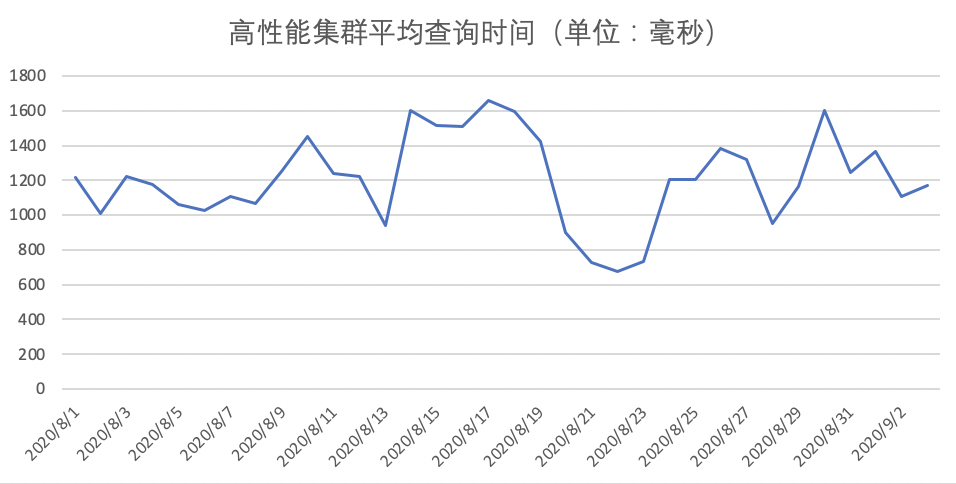 而高性能集群,我们做了很多稳定性和性能优化工作,保证了平均查询时间小于2S。如下图所示: